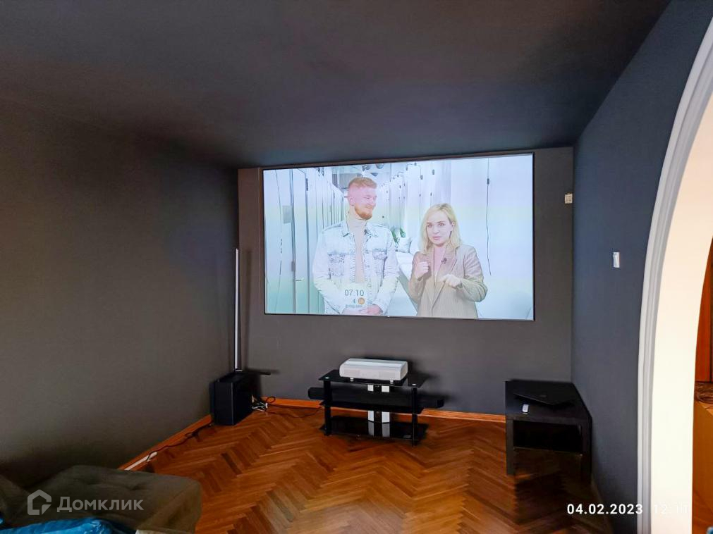 Гостиная оборудована под домашний кинотеатр, где пройдут ваши самые уютные семейные праздники. Короткофокусный проектор Самсунг-Премьер, к нему - специальный огромный экран во всю стену - 120 дюймов.
