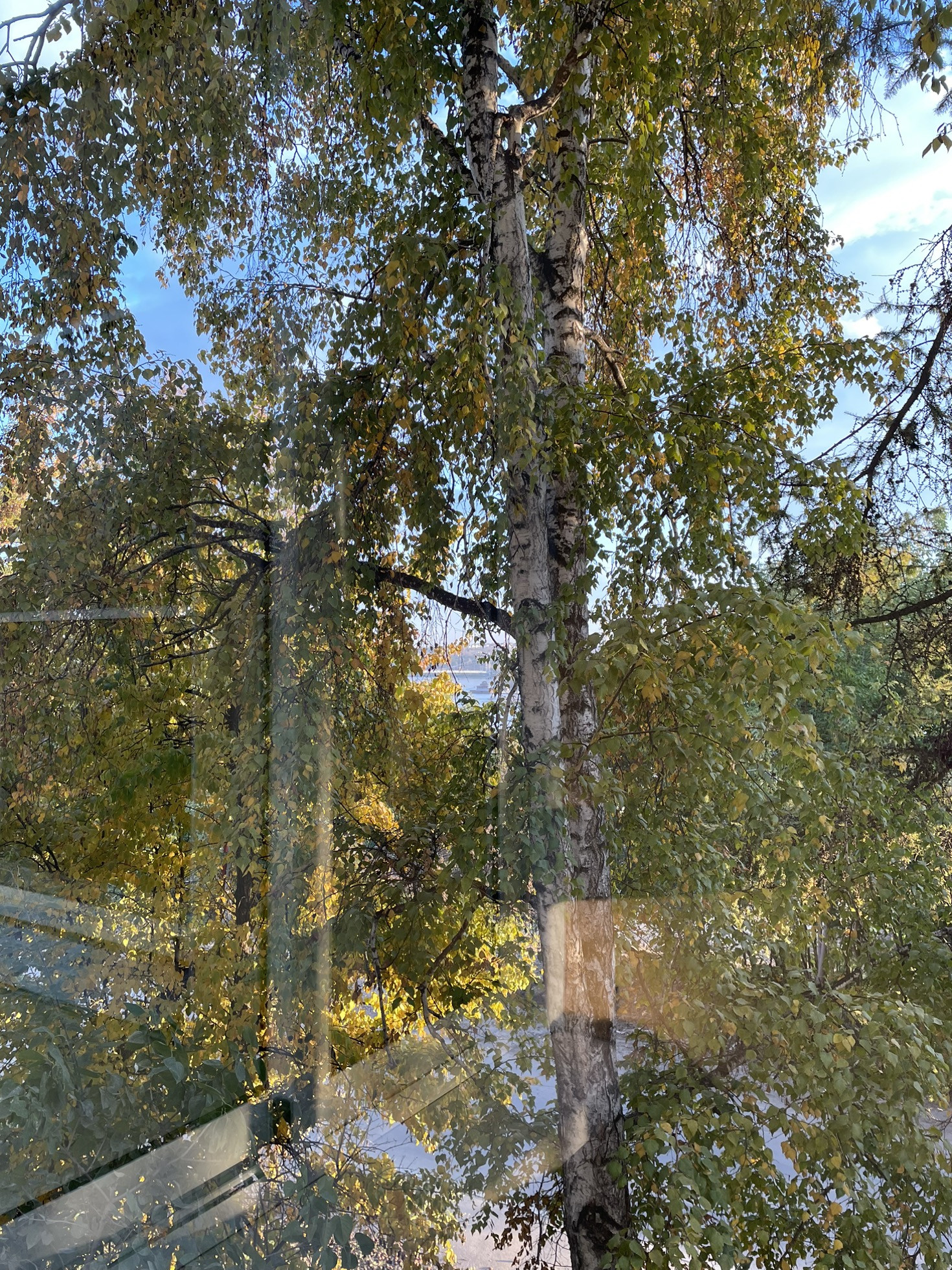 Вид из окна на пробегающую Ангару и растущие деревья