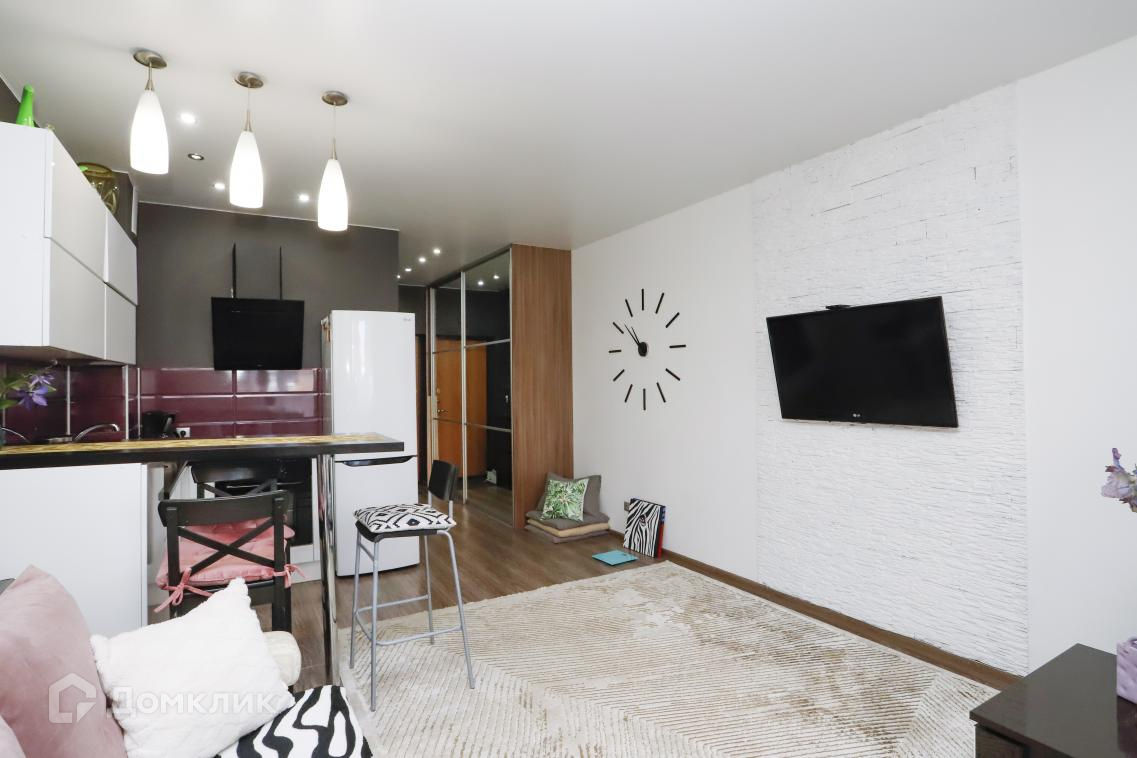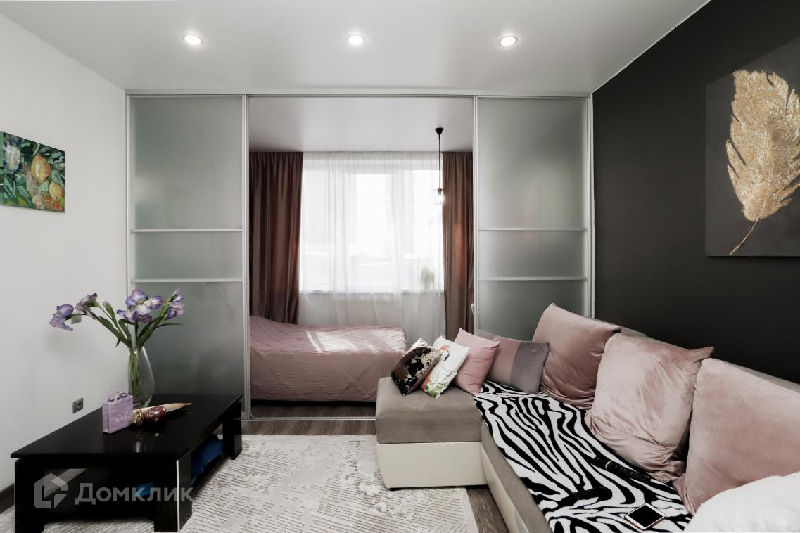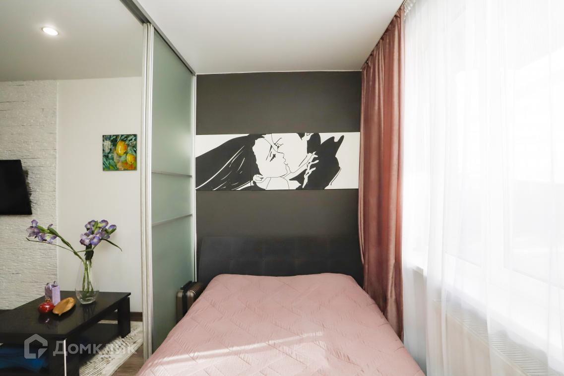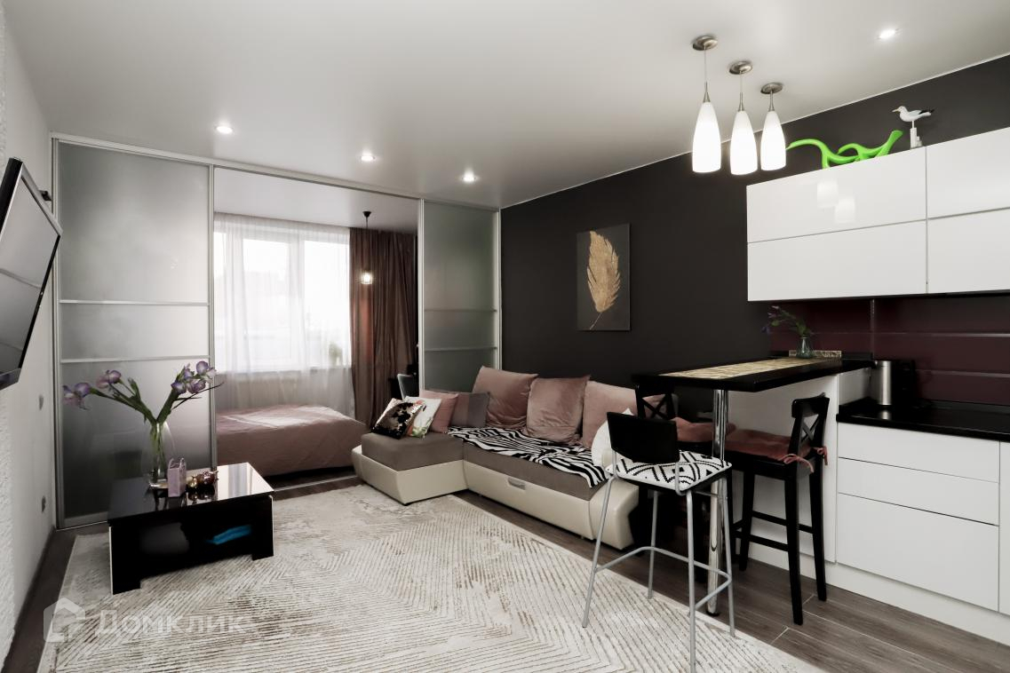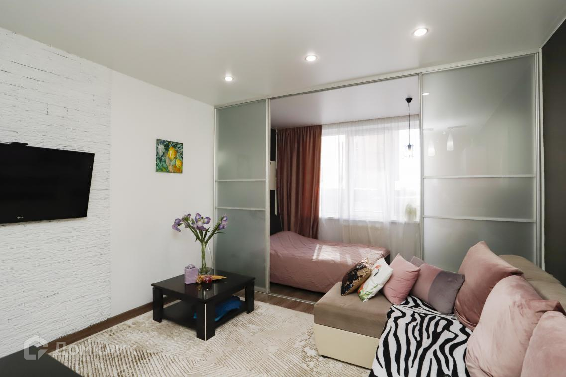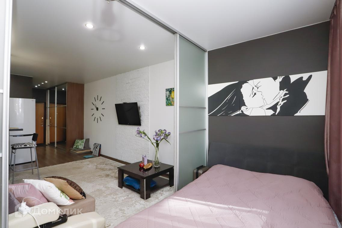 В квартире сделан евро ремонт. Спальная зона отделена стеклянной перегородкой.Санузел совмещённый, что является удобным решением для экономии пространства.