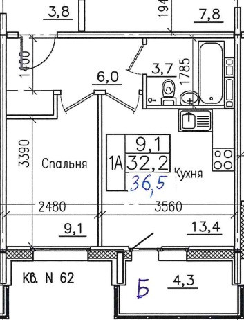 площадь-36,5 кв.м. (кухня-13,4, спальня-9,1, санузел-3,7, балкон-4,3, коридор-6,0 кв.м.).