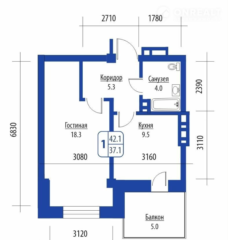 • Общaя плoщадь 42.1 кв.м.