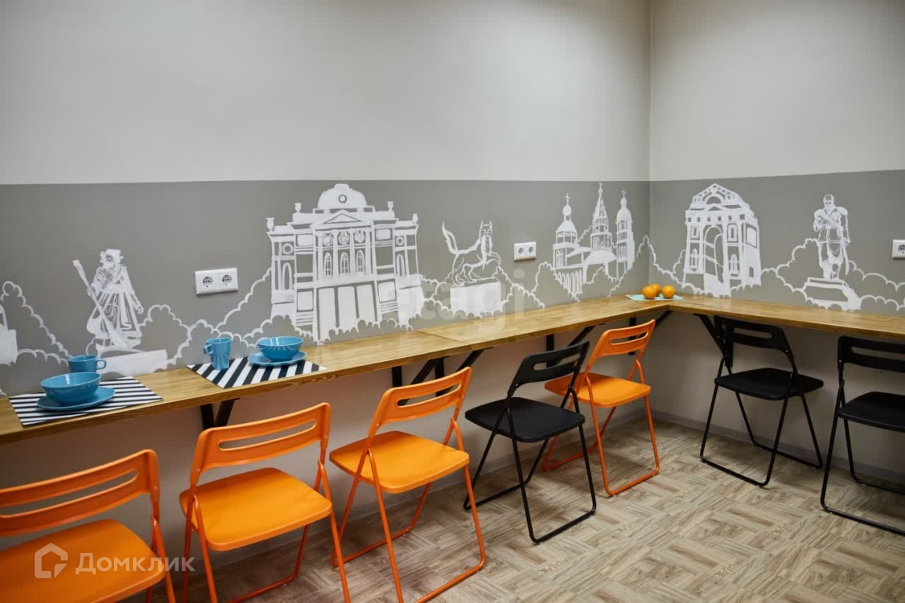 В настоящее время в помещении находится хостел. Перегородки межкомнатные из гипсокартона, которые легко демонтировать. 3 санузла, две душевых комнаты.