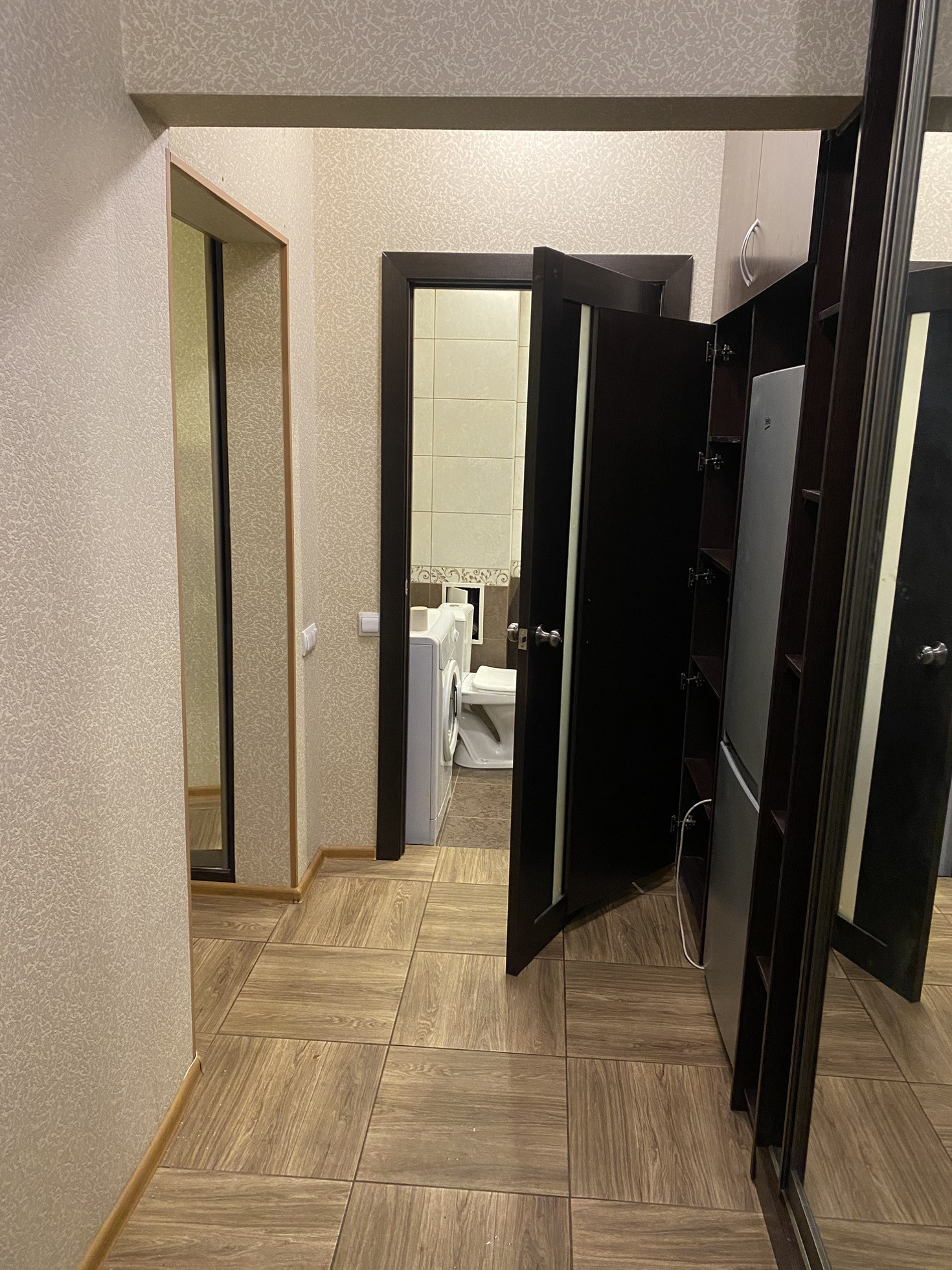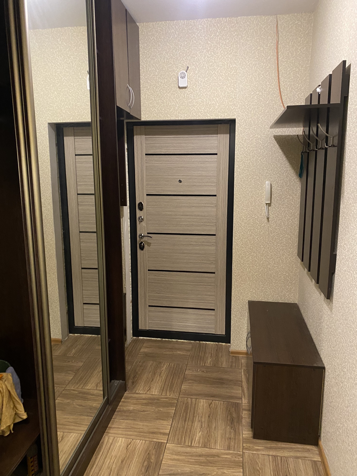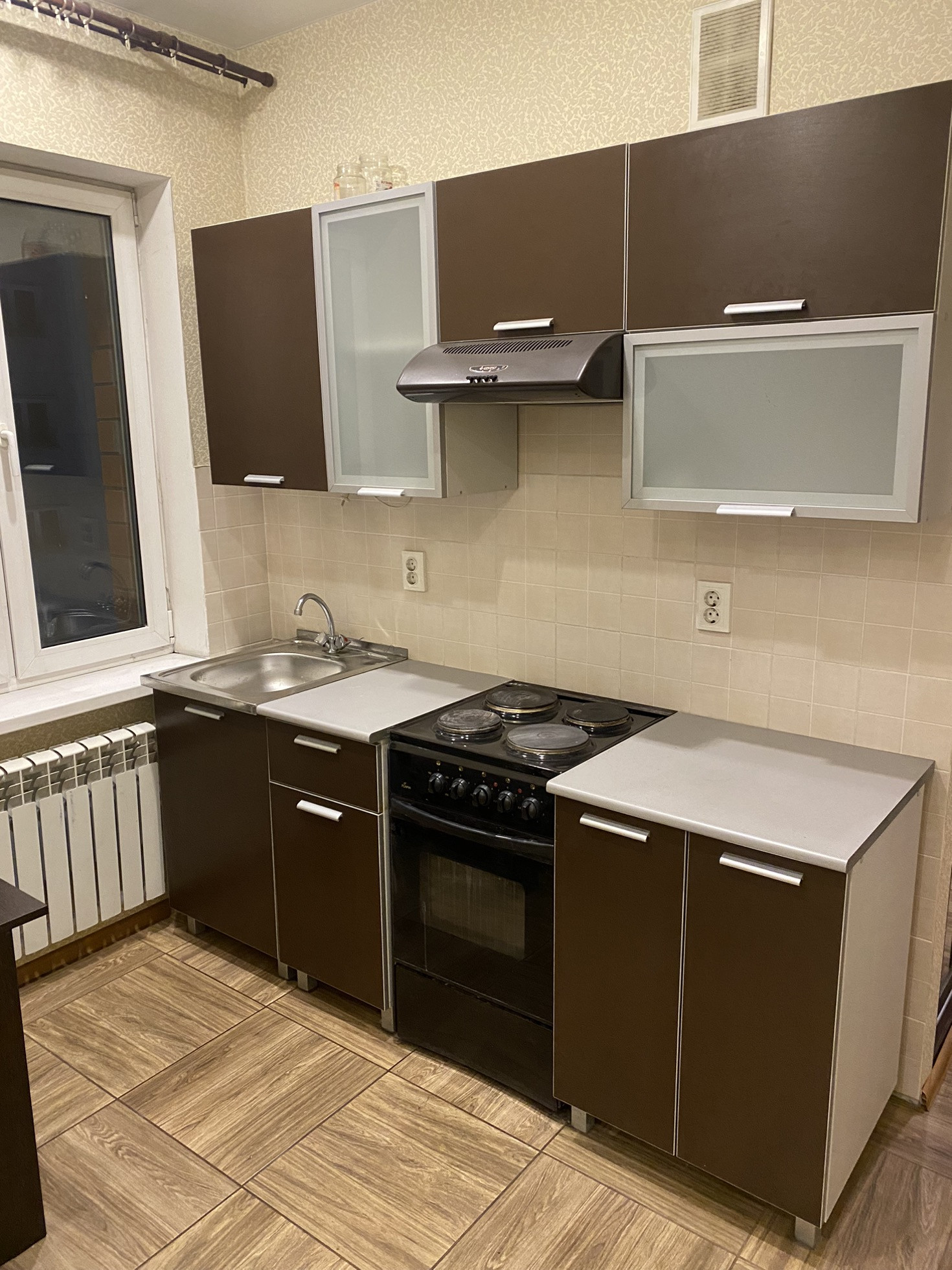 Ремонт хороший, кухонная мебель, встроенные шкафы, прихожая, кухонный стол и стулья, диван, холодильник, плитка, духовка, стиральная машина.