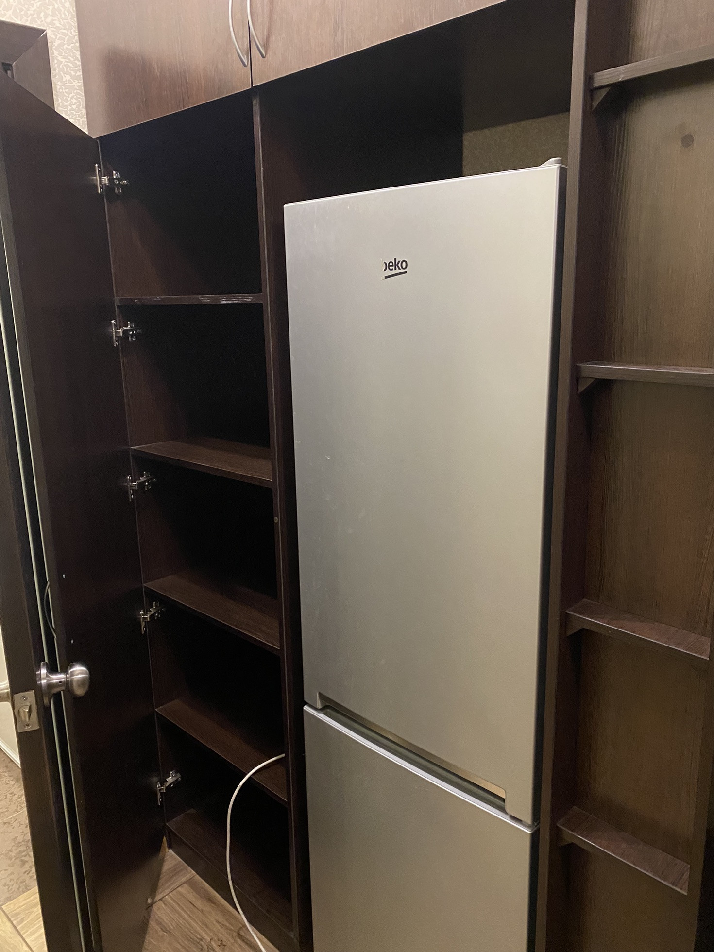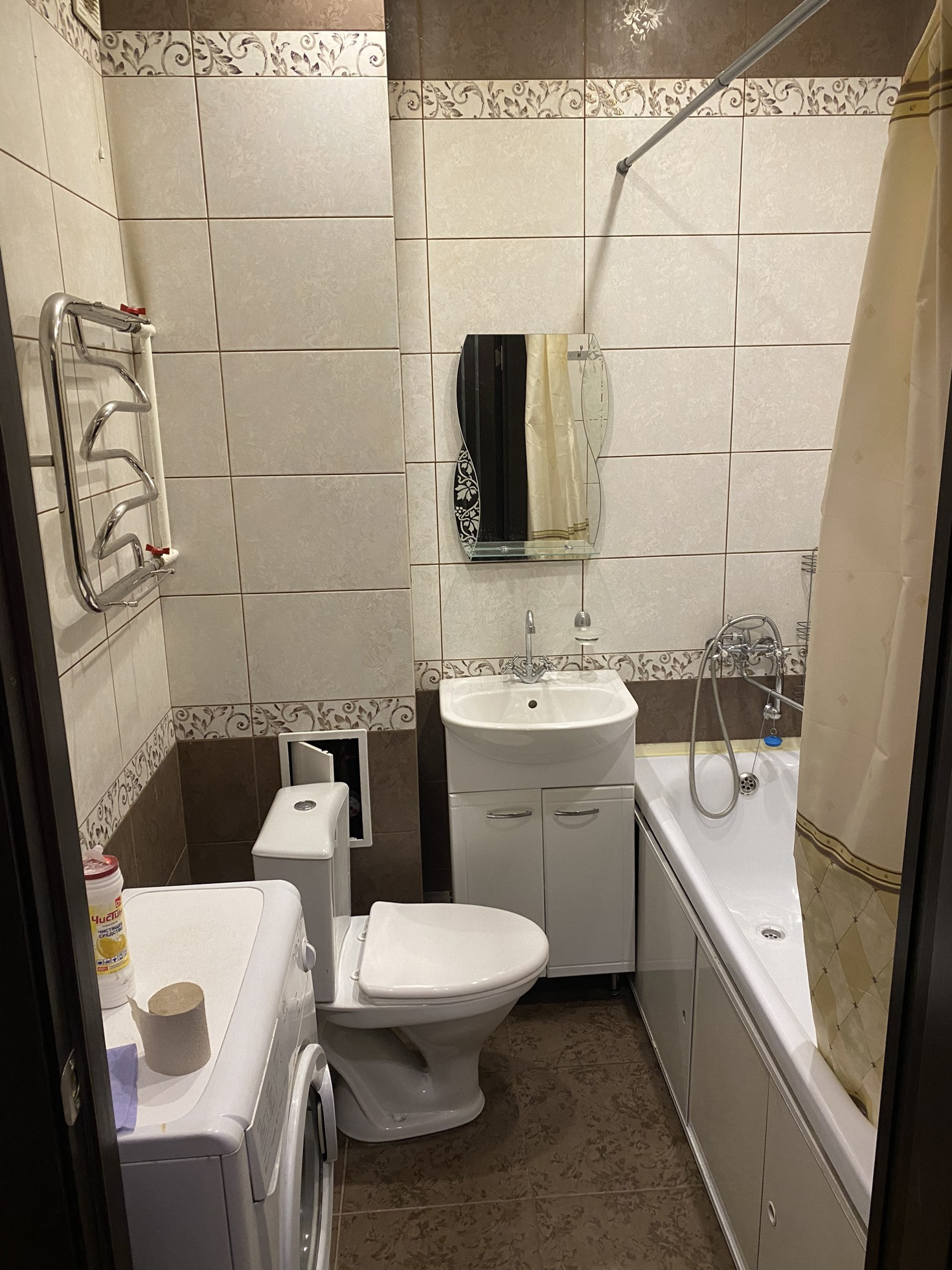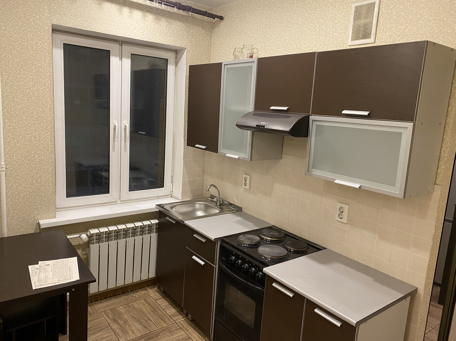 Ремонт хороший, кухонная мебель, встроенные шкафы, прихожая, кухонный стол и стулья, диван, холодильник, плитка, духовка, стиральная машина.