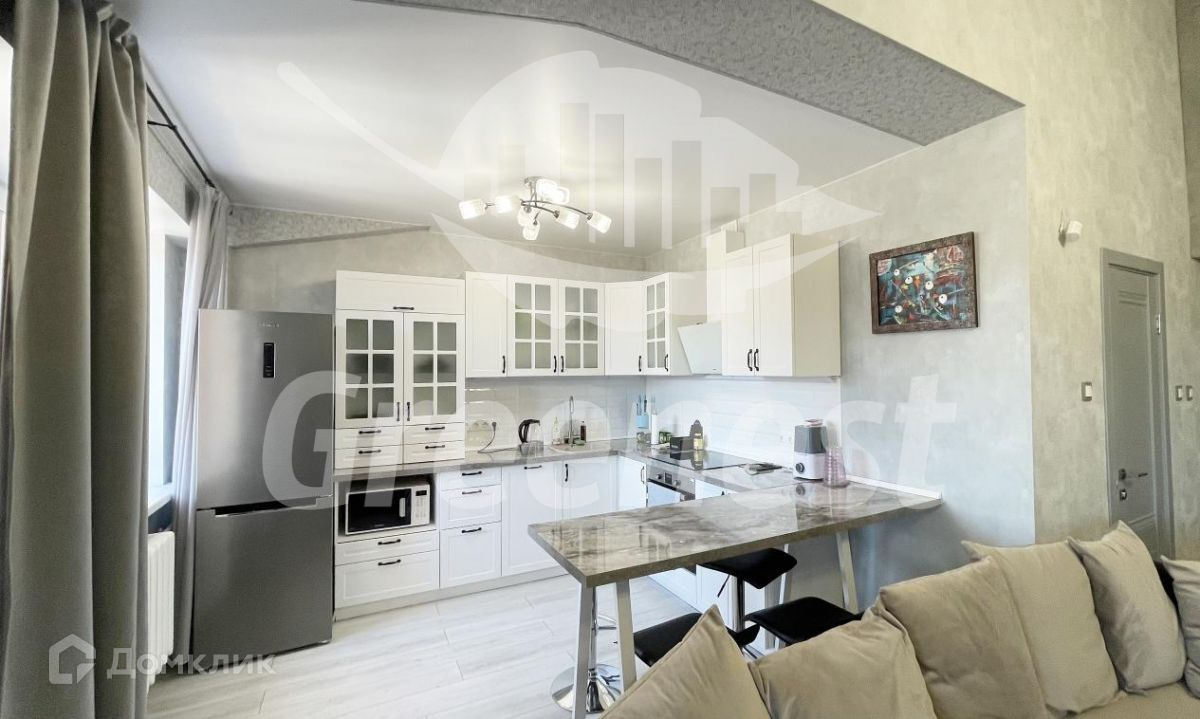 В квартире сделан дизайнерский ремонт. Стильный кухонный гарнитур со всем необходимым для приготовления любимой домашней еды (электрическая плита, духовой шкаф, микроволновая печь, посудомоечная машина, кухонные принадлежности, посуда, столовые приборы, чайник).В том числе: холодильник, барный стол со стульями, удобная двухспальная кровать, на которой приятно спать, диван, стиральная машина, сушилка для белья, утюг, телевизор, кондиционер, пылесос.