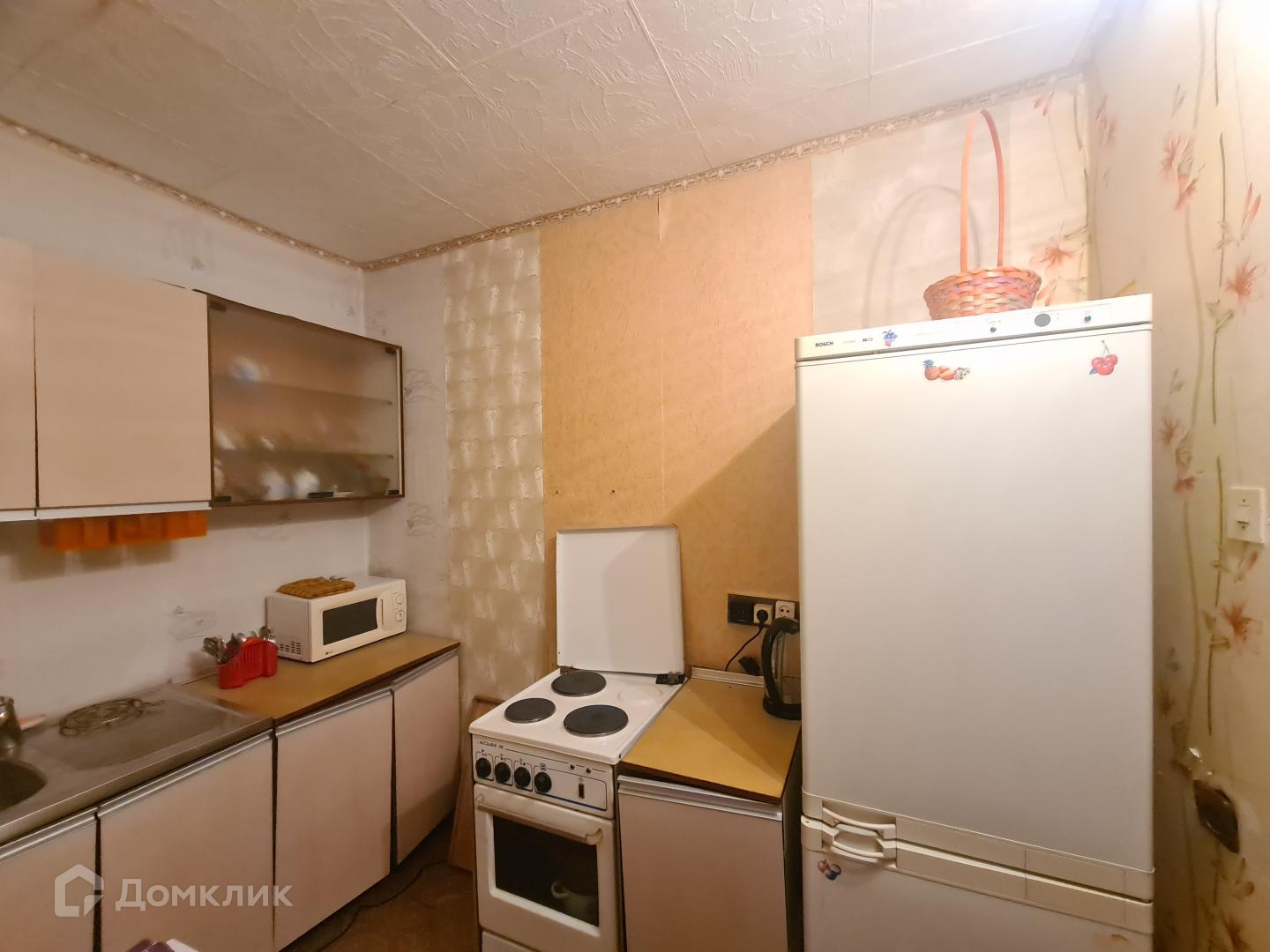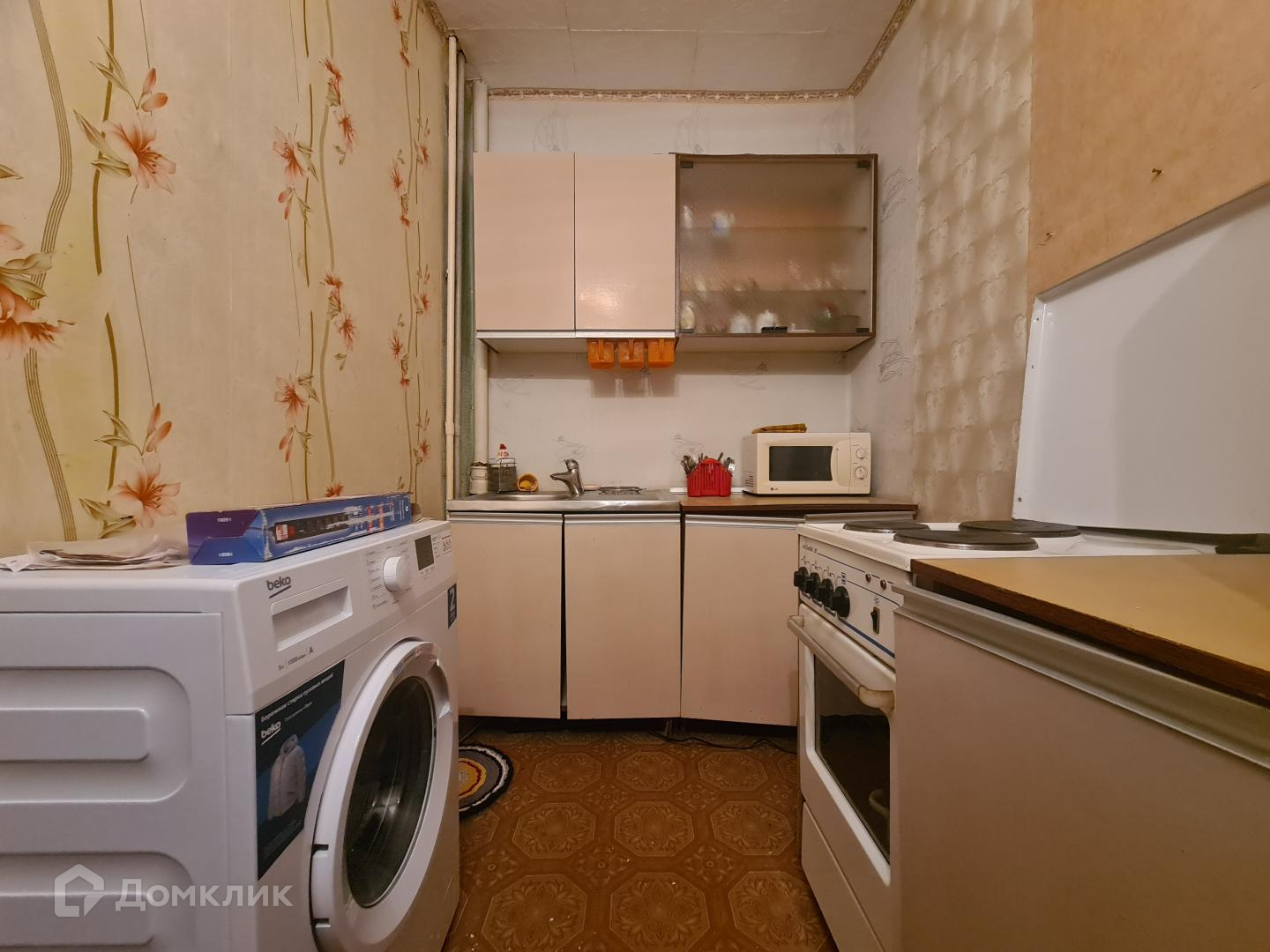 Холодильник, электропечь, стиральная машина, кухонный гарнитур, шкафы для одежды, кровать.