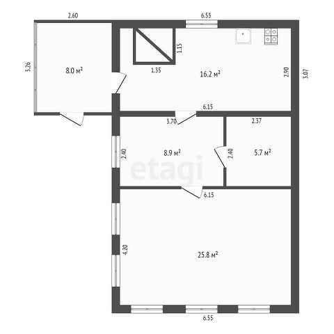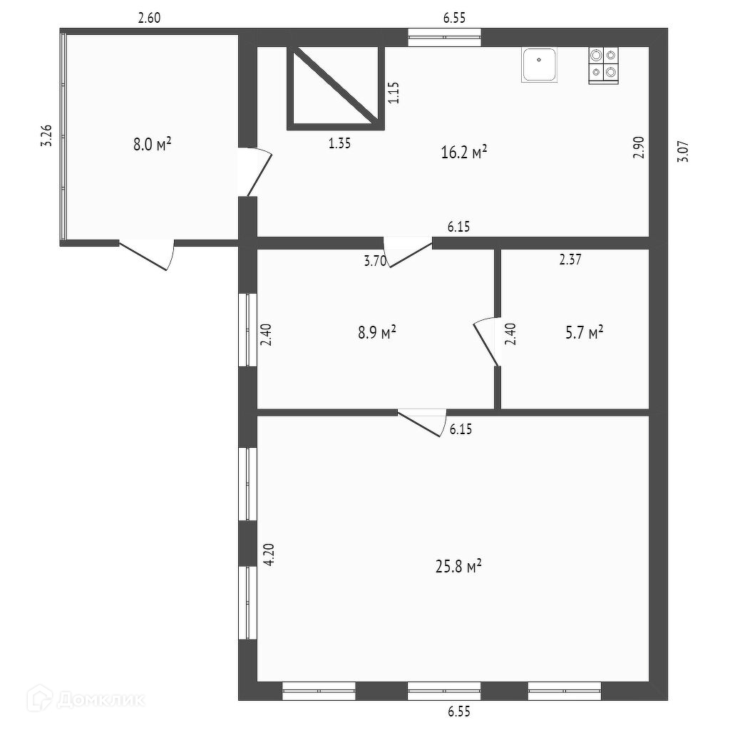 Одна из комнат 25,8 кв.м., вторая 8,9 кв.м., третья 5,7 кв.м., кухня 16,2 кв.м.