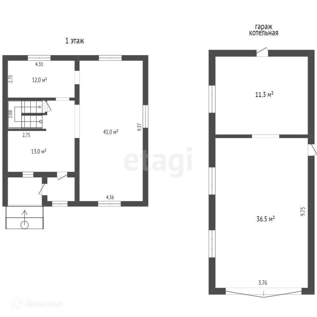 В доме 2 входа: один с лицевой стороны, второй со стороны двора. Из дома вы сможете сразу перейти в гараж, вмещающий две машины. Под домом находится подвальное помещение (68,3 кв.м.).