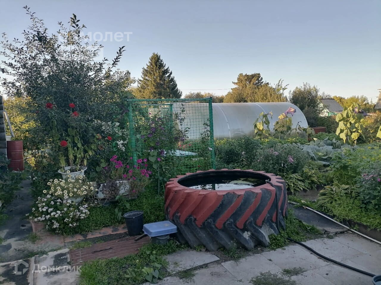 -Сад утопает в многочисленных цветах: гортензии, розы, хризантемы, флоксы, клематисы, хосты, живая изгородь из девичьего винограда. На площадке перед домом растут дуб, липа, лиственница.