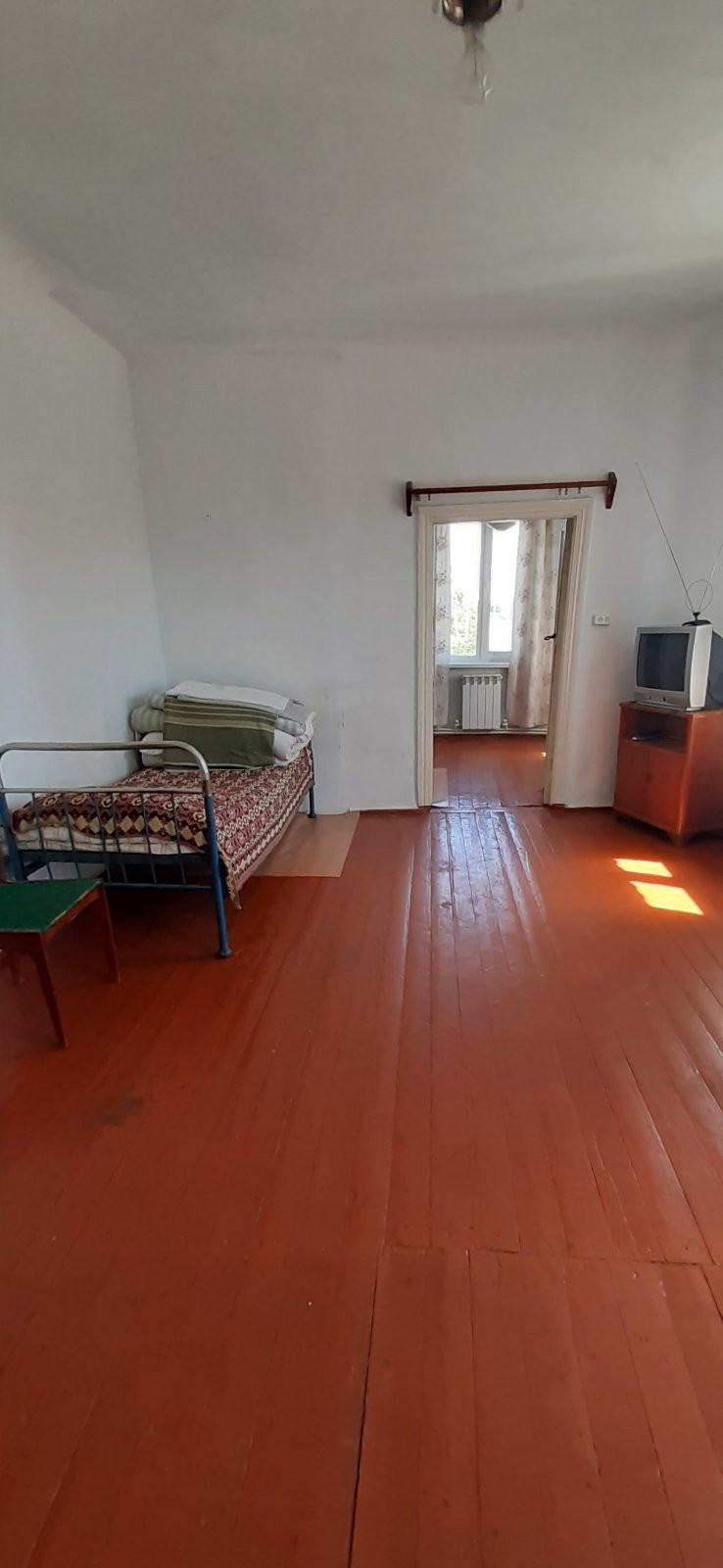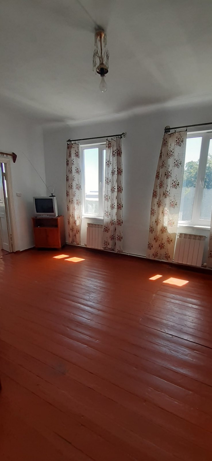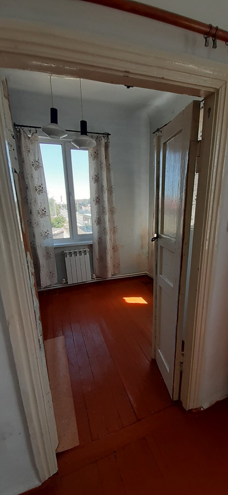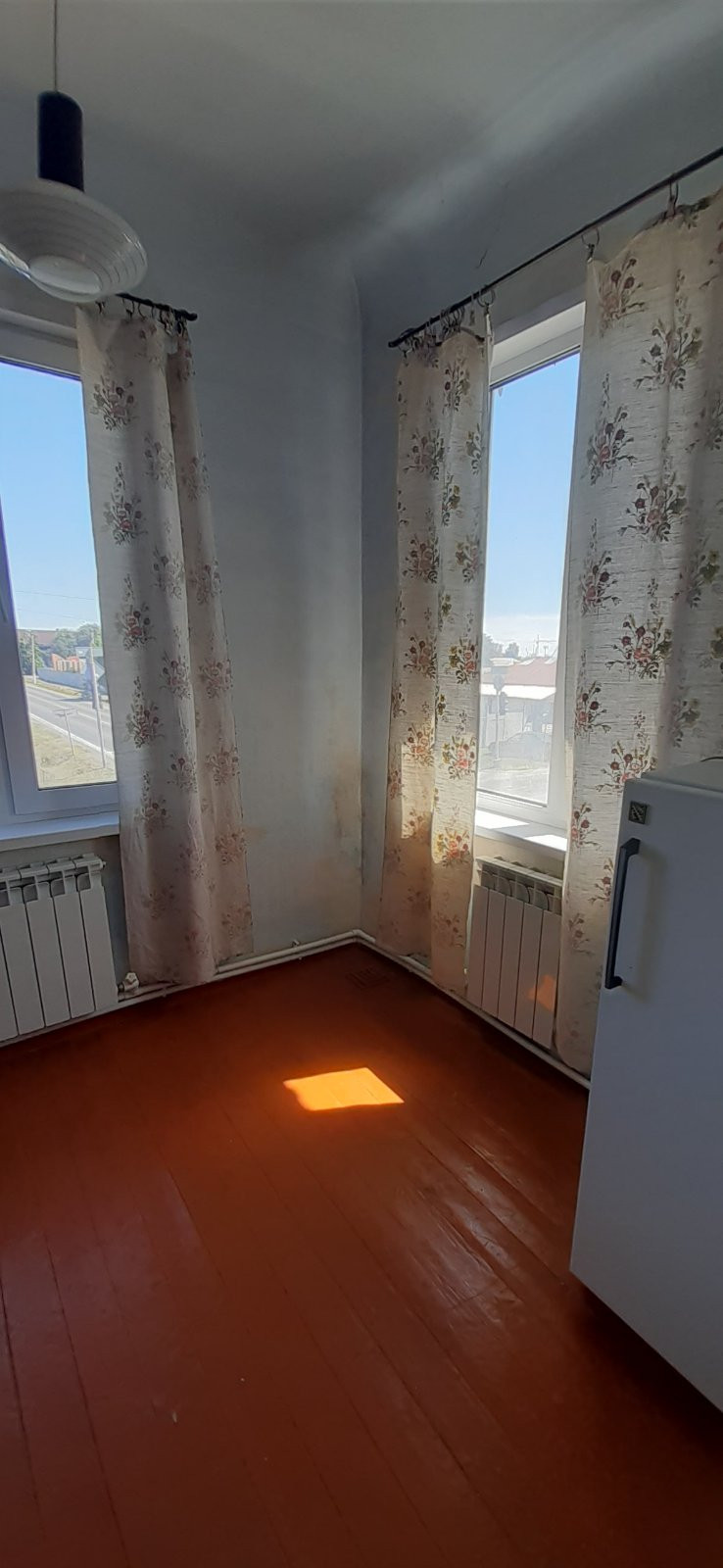 Пластиковые окна, пол деревянный, на кухне на полу линолеум.