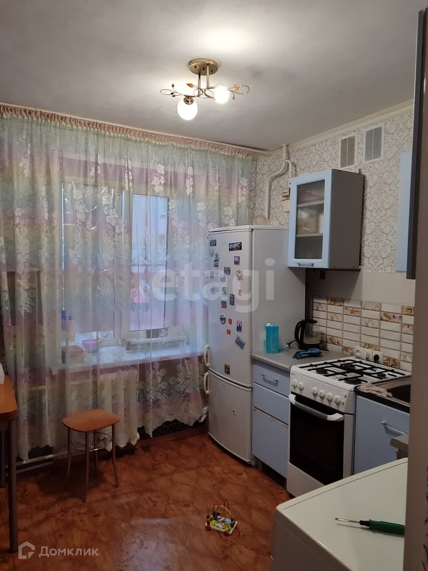 В квартире чисто и уютно. На полу линолеум, окна пластиковые, на стенах обои, санузел в кафельной плитке. При продаже остается: встроенный шкаф с зеркалами, диваны, кухонный гарнитур, холодильник, стиральная машина, бойлер.