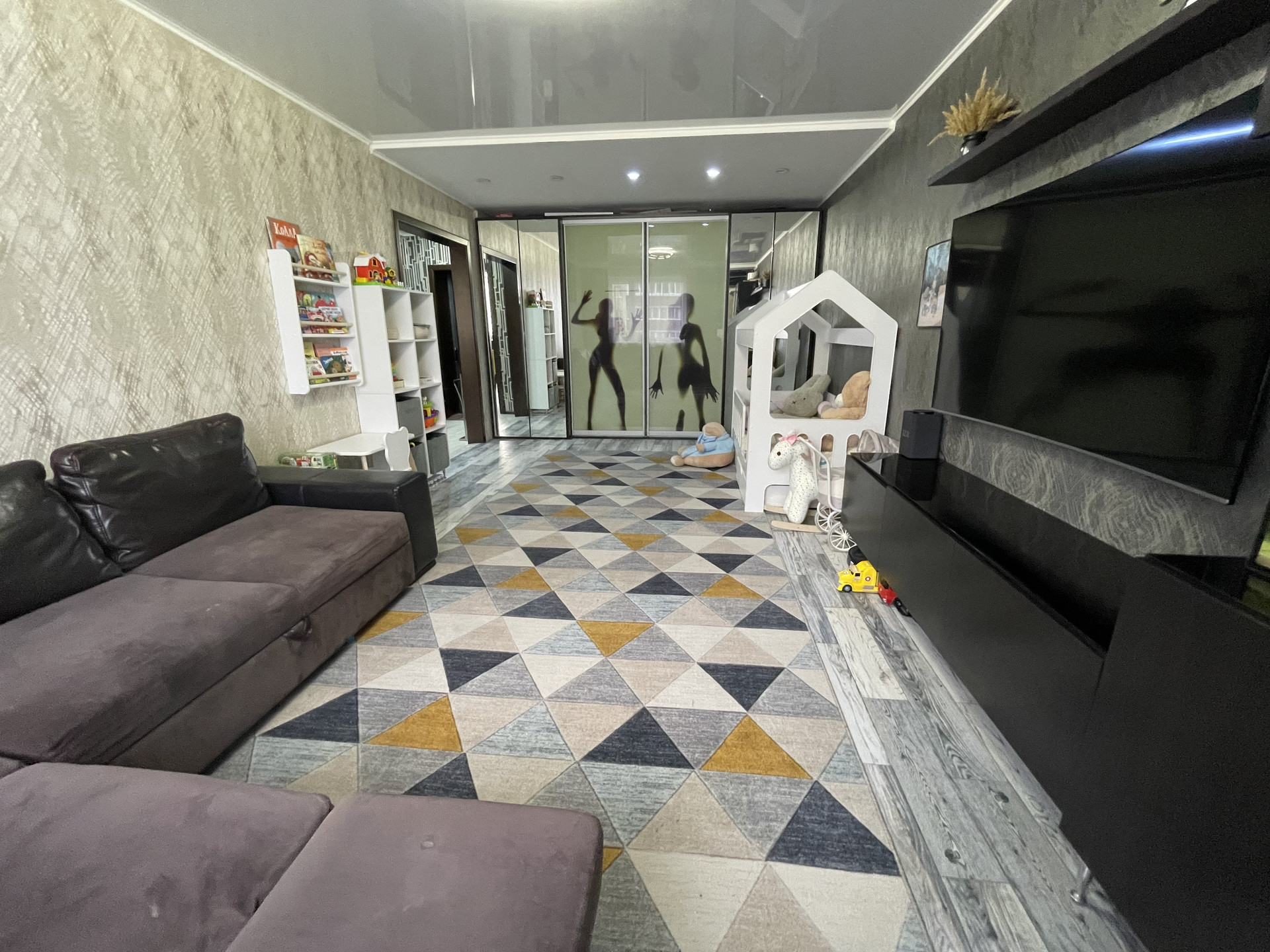В зале остается эргономичный вместительный шкаф, с множеством зон для хранения.