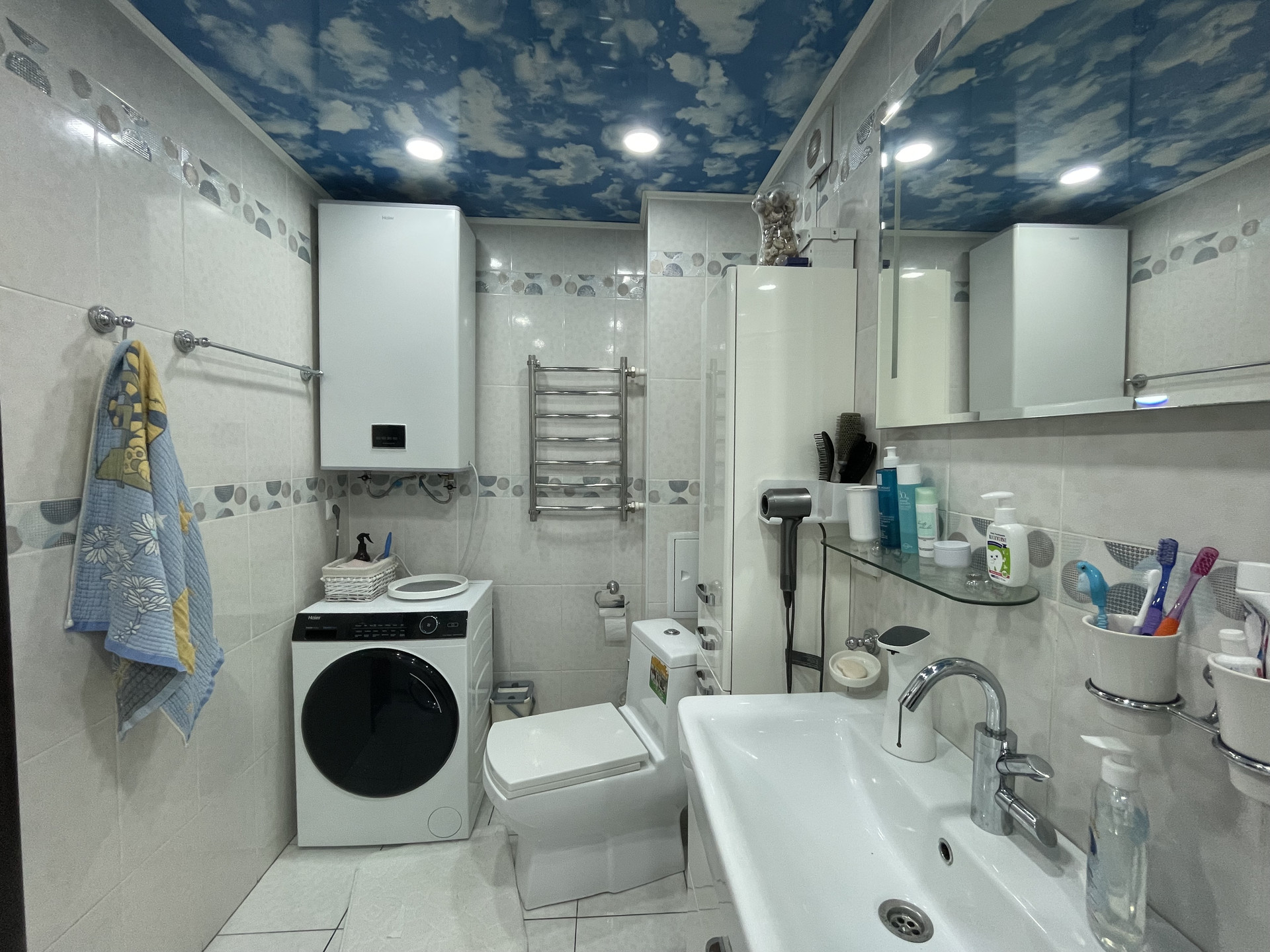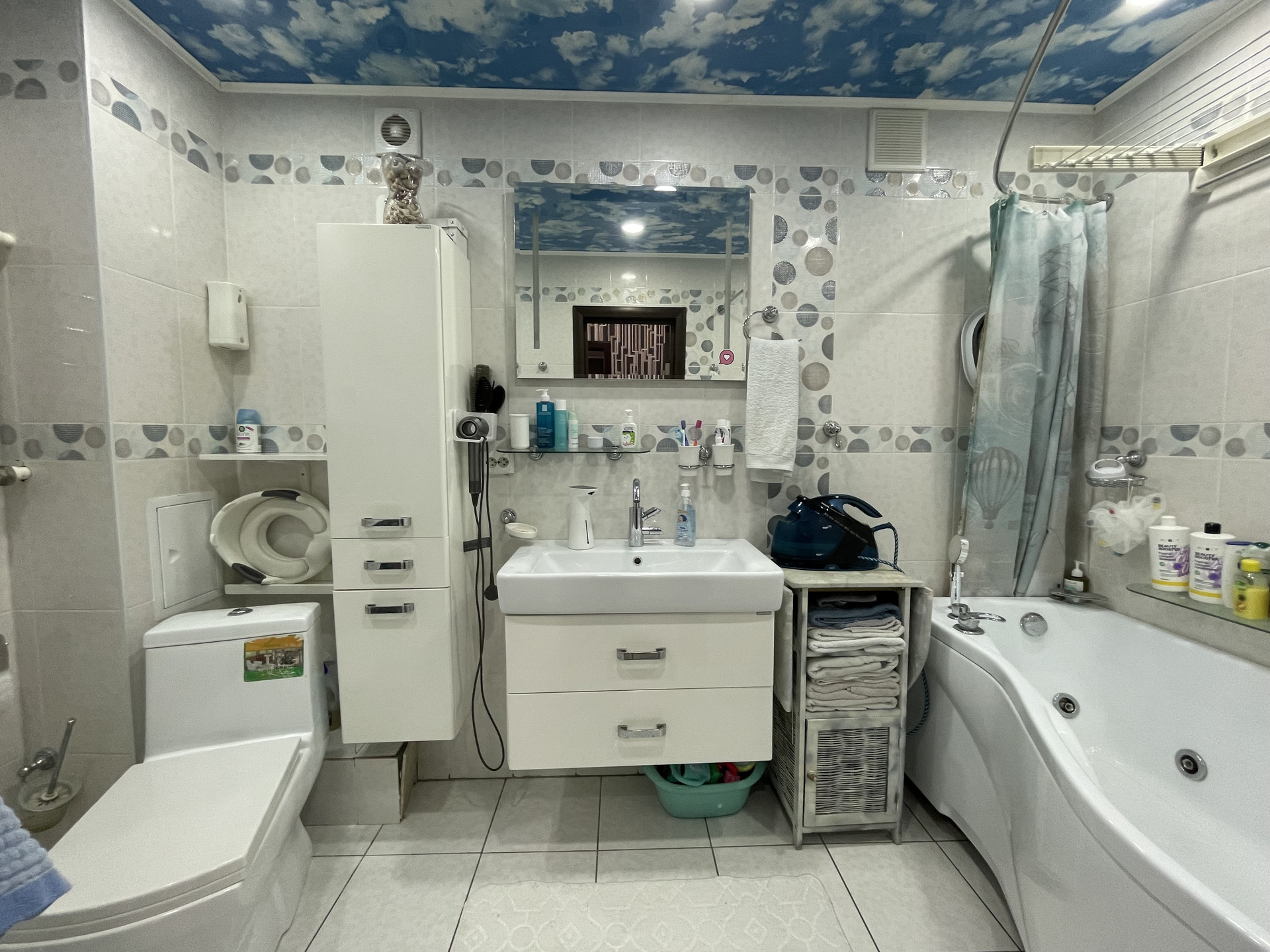 Ванная выложена до потолка изящной кафельной плиткой, установлена гидромассажная ванна (джакузи), остается раковина с тумбой, пенал, полочки, зеркало.