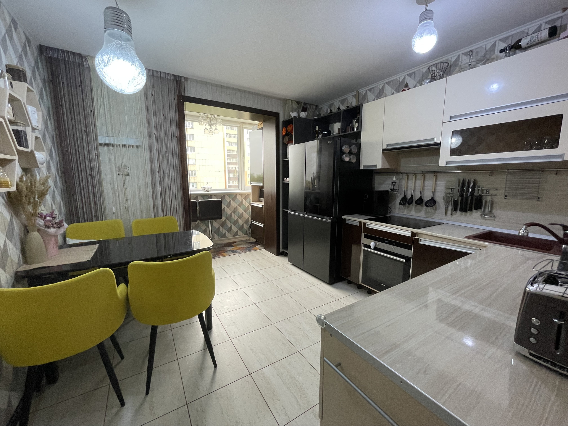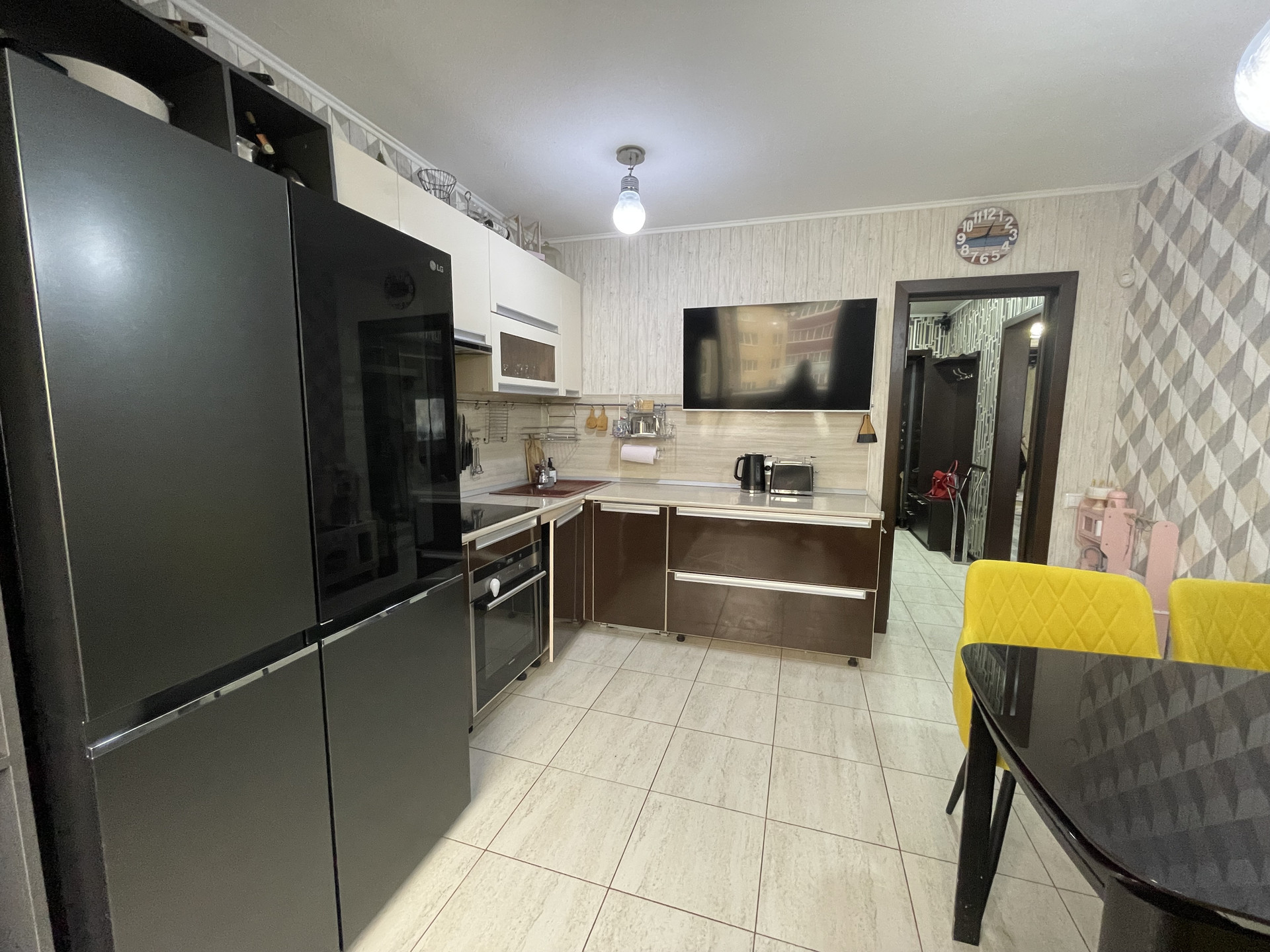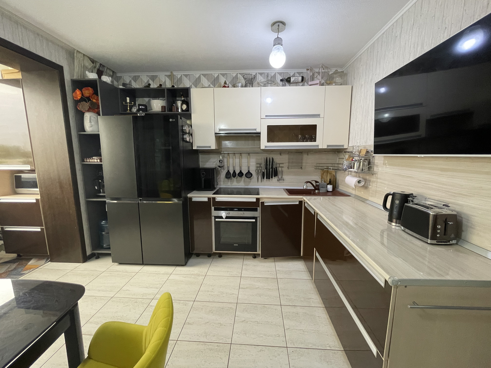 Кухня оснащена встроенной мебелью и техникой: газовая варочная поверхность, духовой шкаф, посудомойка все в хорошем рабочем состоянии; остается современный кухонный гарнитур, светильники, люстры.