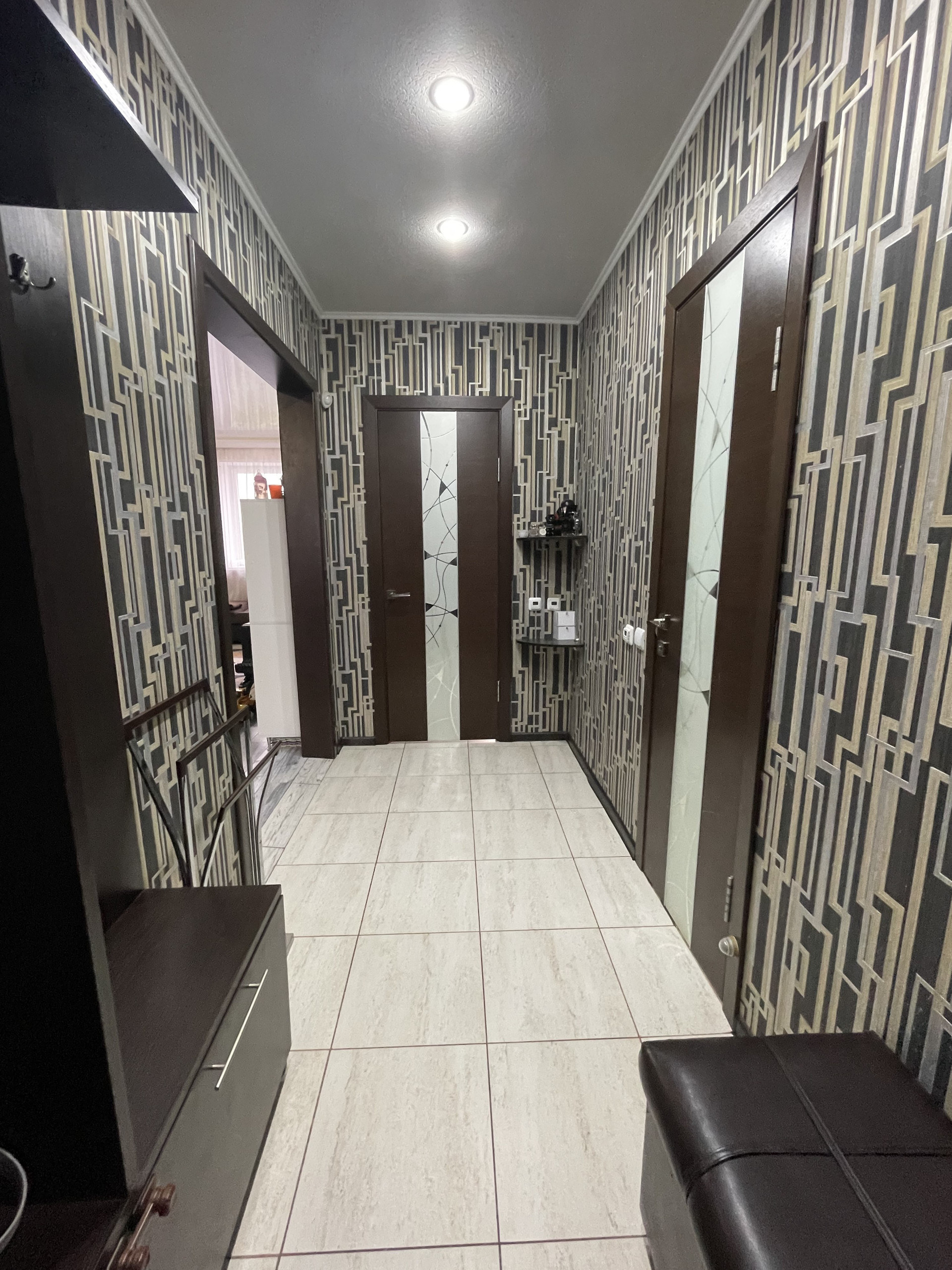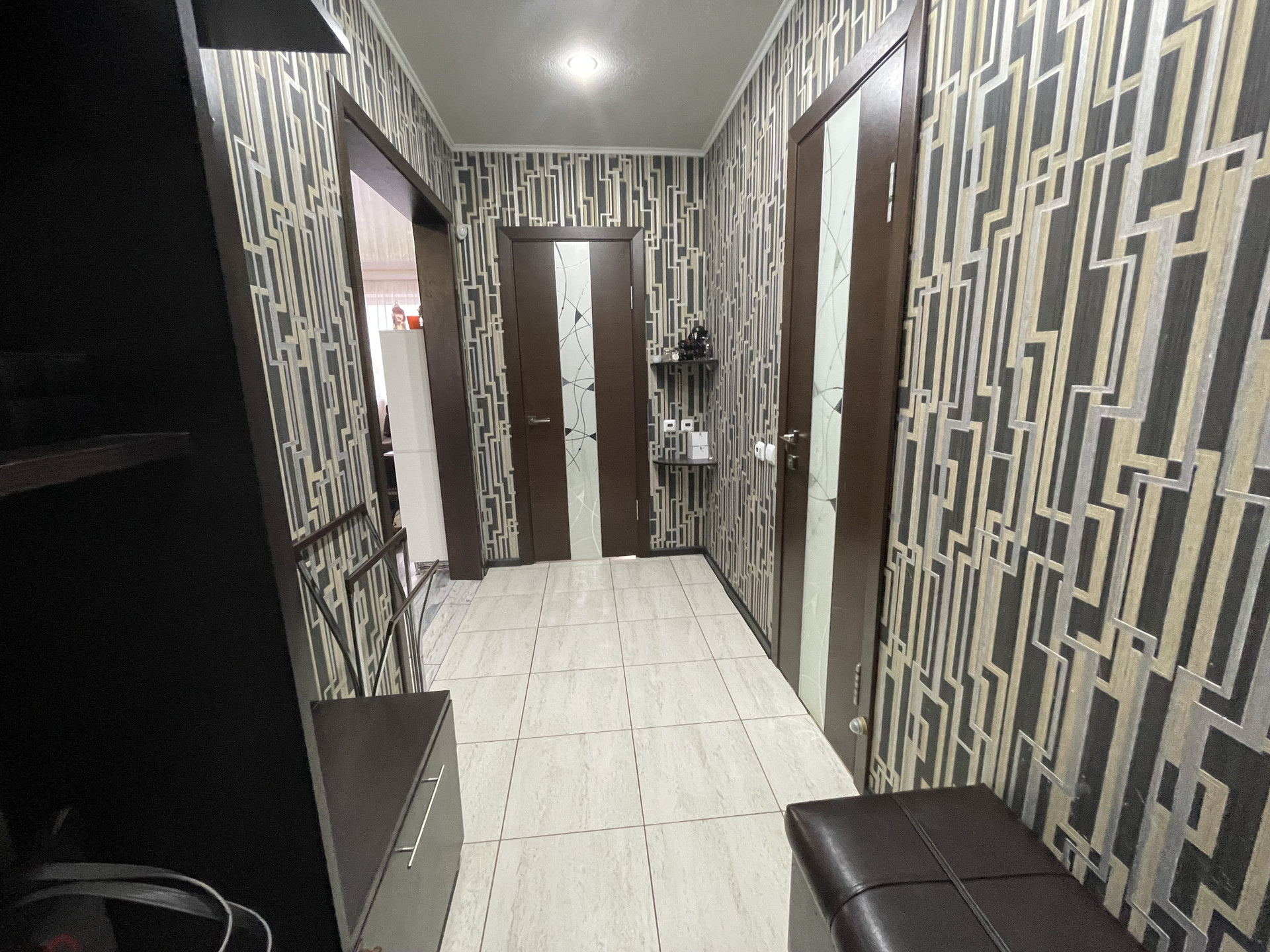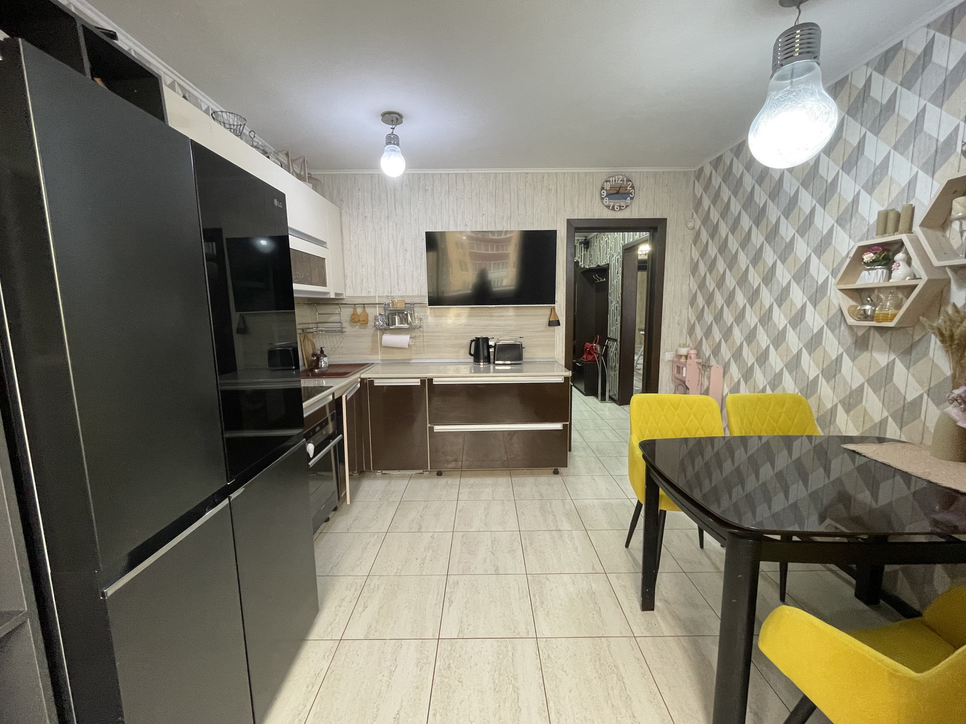 Кухня оснащена встроенной мебелью и техникой: газовая варочная поверхность, духовой шкаф, посудомойка все в хорошем рабочем состоянии; остается современный кухонный гарнитур, светильники, люстры.