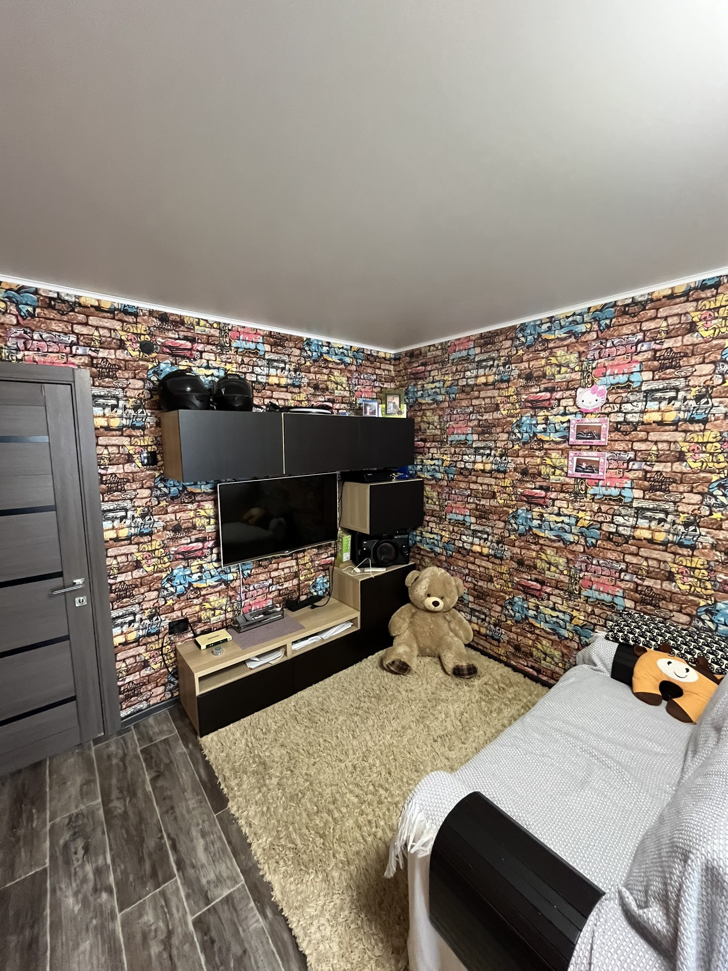 Зал визуально поделен на две зоны первая как зона приятного просмотра телевизора или  в видео игры на PS4
