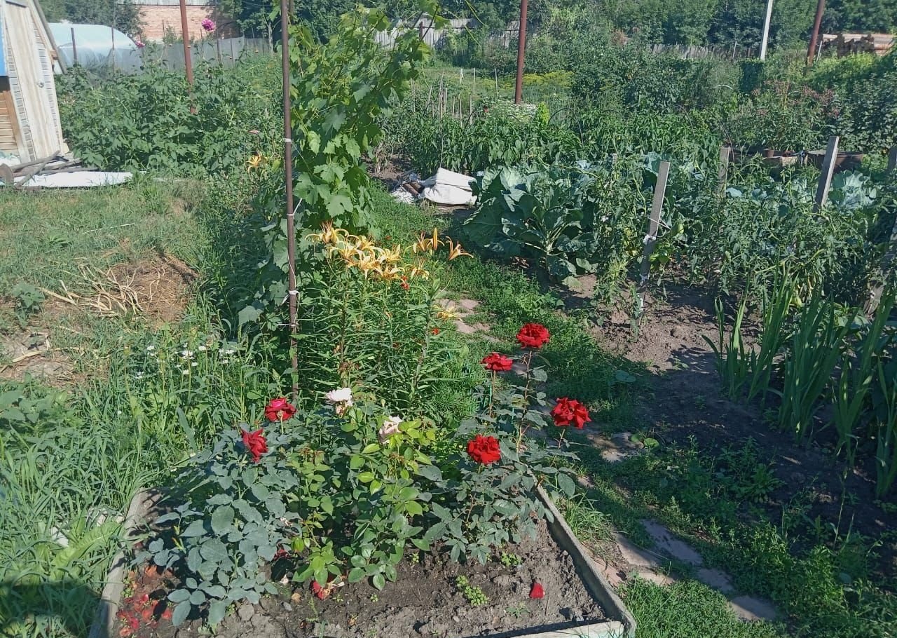 Огород 10 соток. Ухоженный. Посажены все растения с любовью. Много цветов.