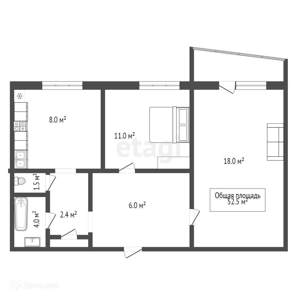 Общая площадь 52.5 м2
