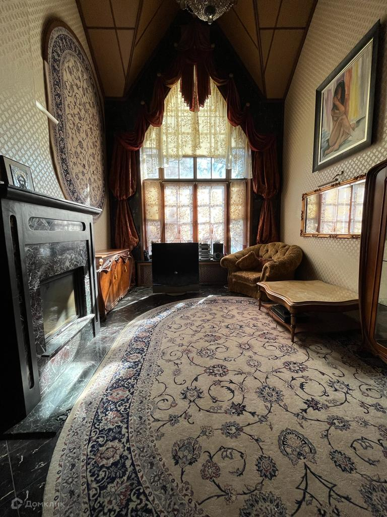 Большая гостиная со вторым светом. Тёплый пол. С камином из мрамора. Обставлена итальянской мебелью. Большой диван, 2 кресла. Комод. Витрина. На полу натуральный шерстяной ковер, ковром из этой же серии декорирована стена.