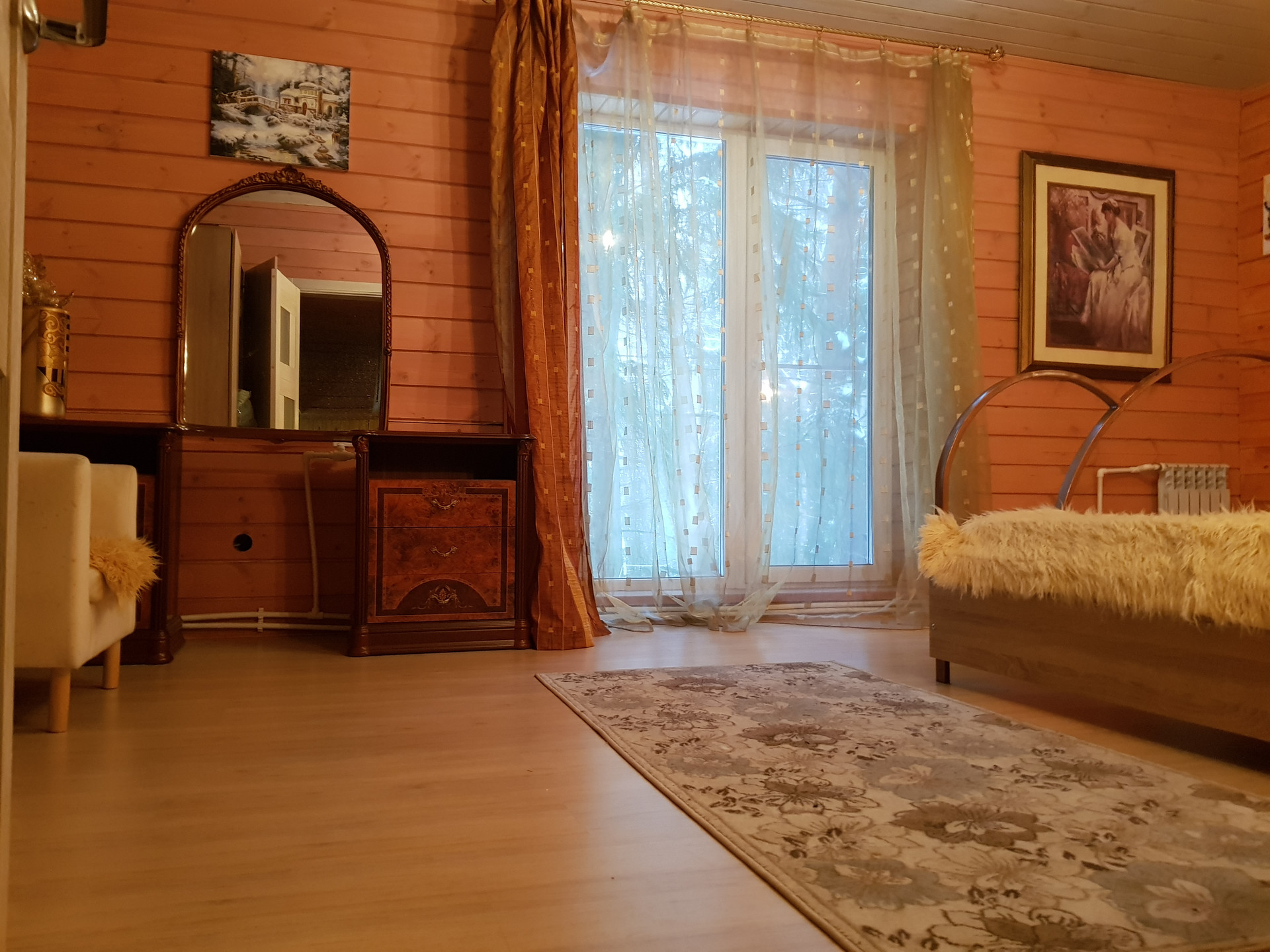 Второй этаж - основная спальня с панорамными окнами на монастырь, парк и лес, и еще гардеробная комната. Санузлы с душем на каждом этаже.