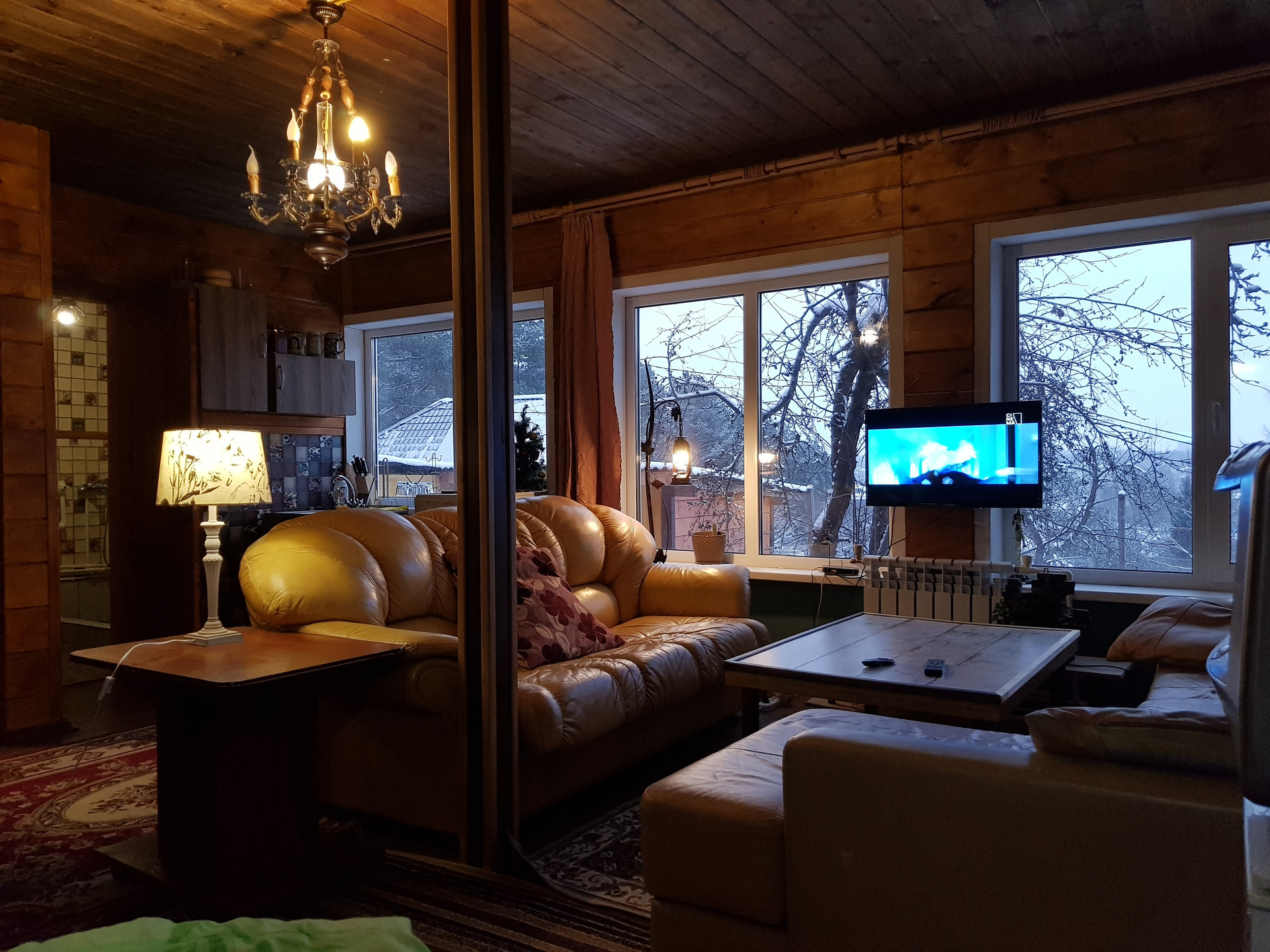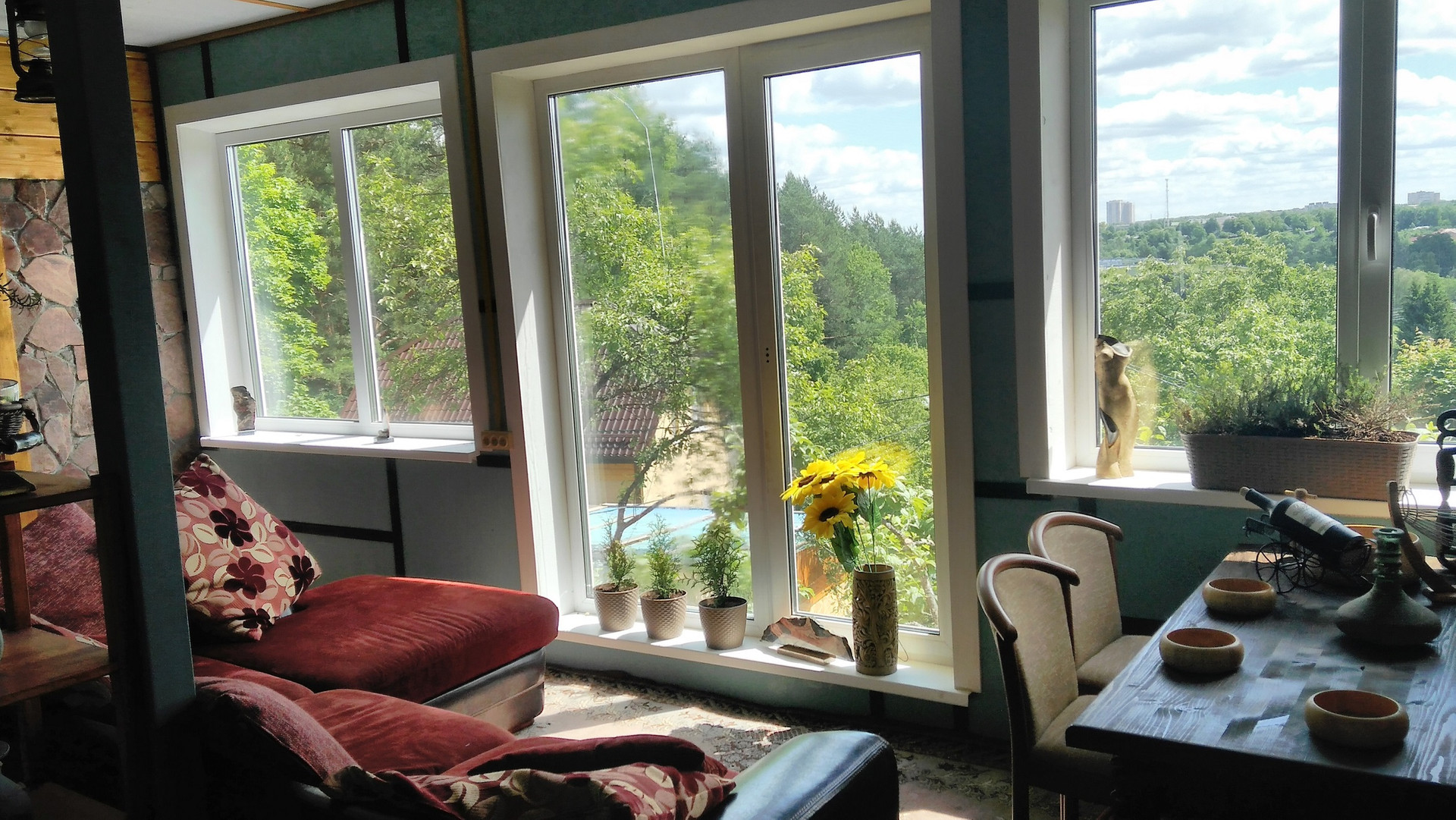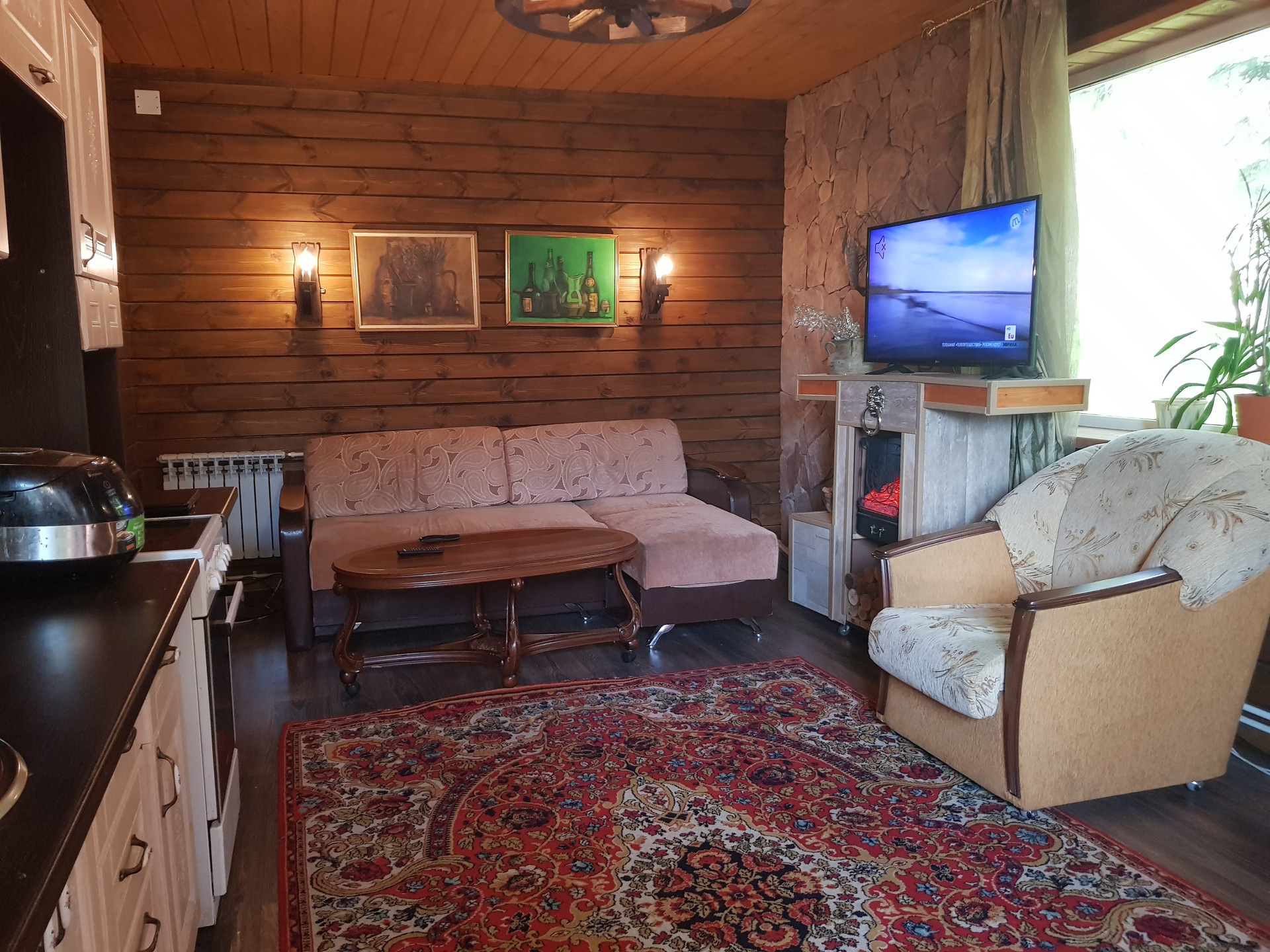 Первый этаж в гостевом доме — это гостиная с кухонной зоной. Три окна с прекрасными видами. И малая спальня.