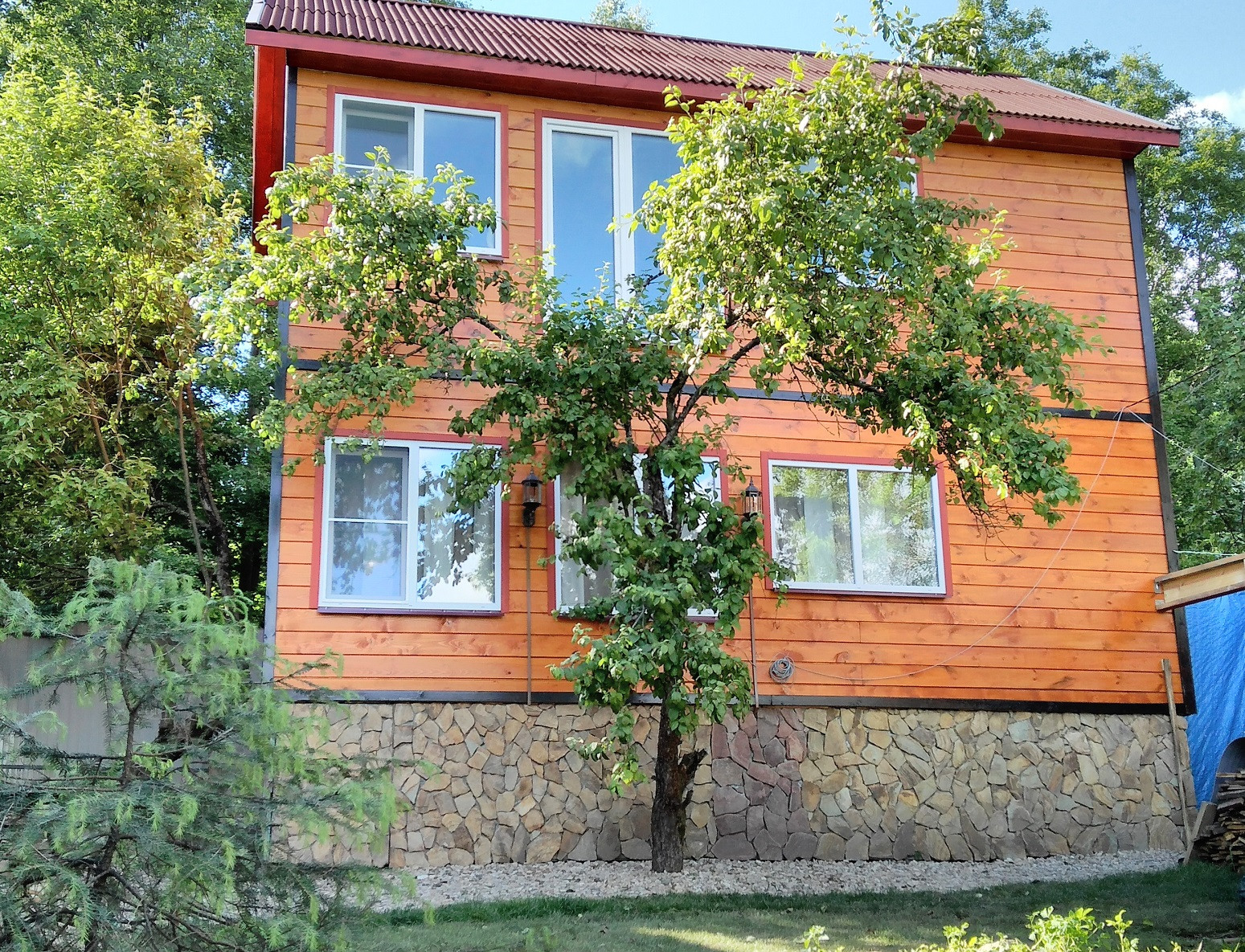 Фундамент ленточный с заглублением на полтора метра с обвязкой металлической балкой. Каркас дома из металлической балки швеллер. Внешняя и внутренняя отделка качественное дерево, новый сайдинг. Утеплитель 20 см Роквул. Кровля ондулин и поликарбонат над верандой 3-го этажа.