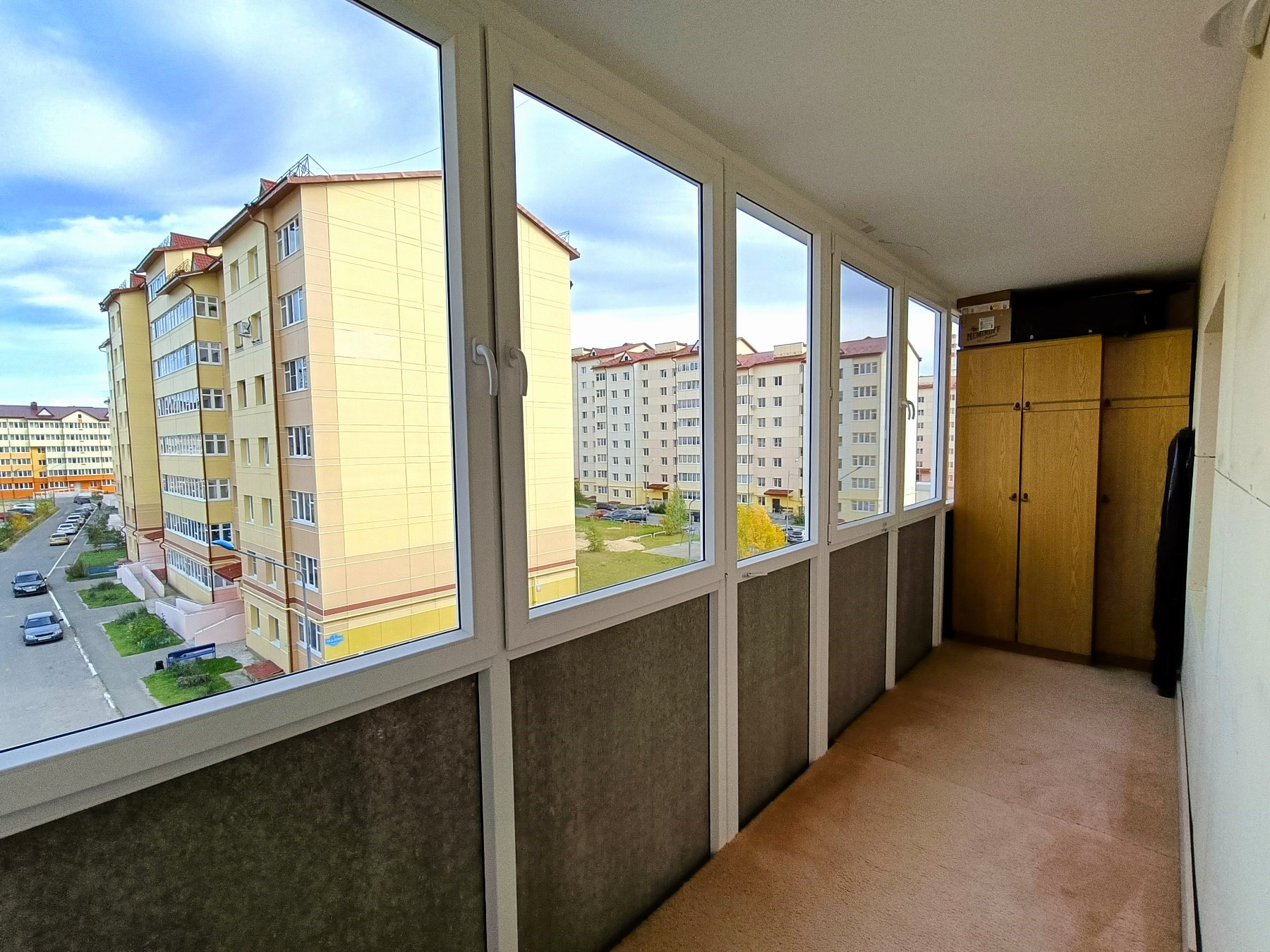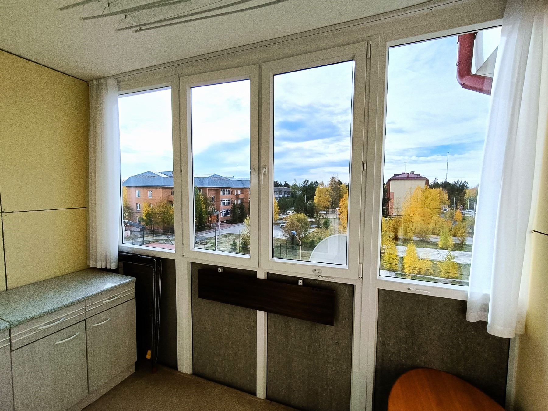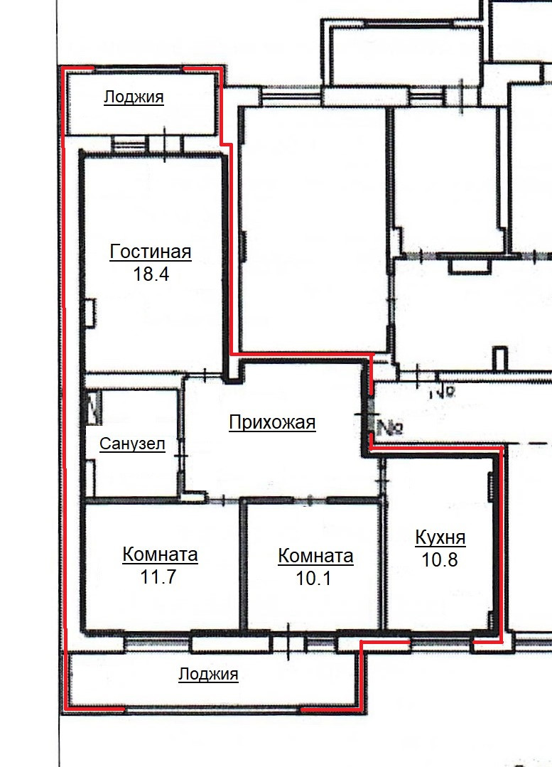 Комнаты изолированные (18,4 м² + 11,7 м² + 10,1 м²), большая кухня (10,8 м²), санузел совмещенный, везде установлены пластиковые окна, 2 лоджии, застекленные окнами ПВХ, установлены счетчики на холодную, горячую воду, электроэнергию и отопление.