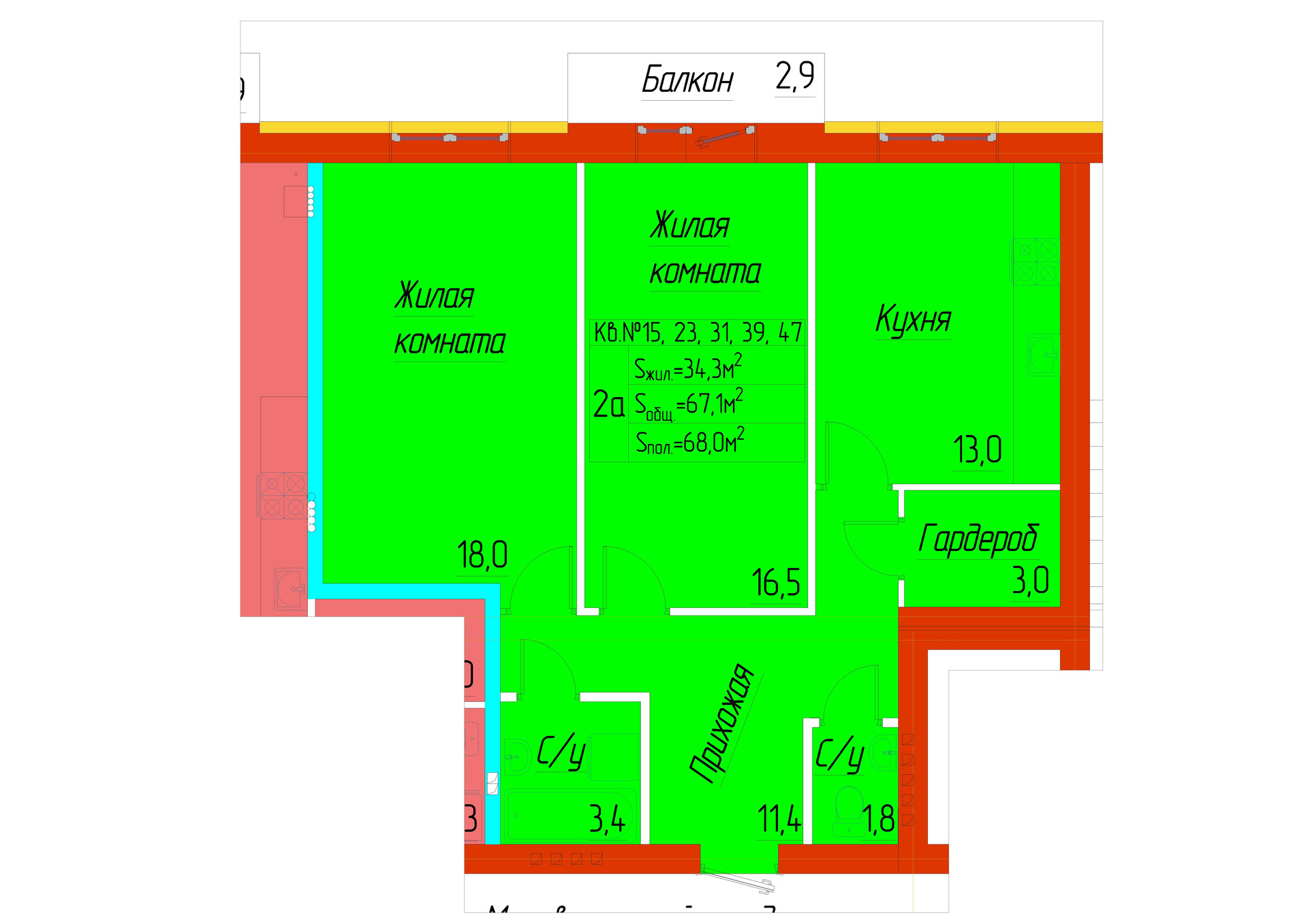 Жилая площадь 34.5 м2