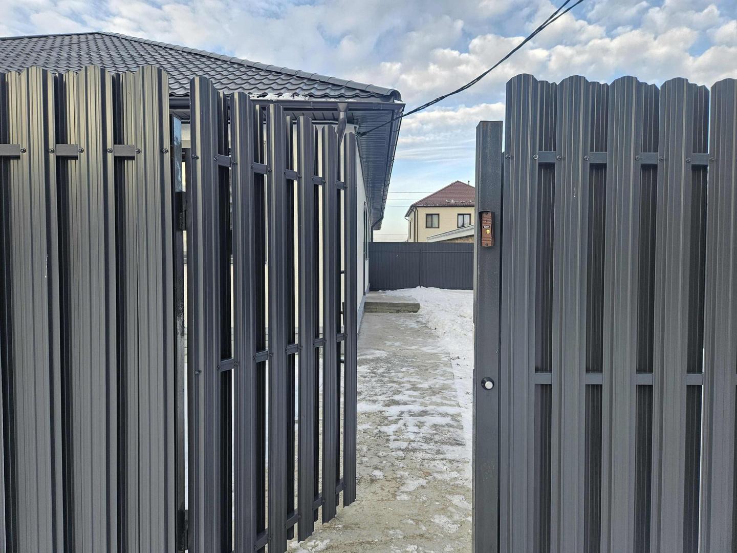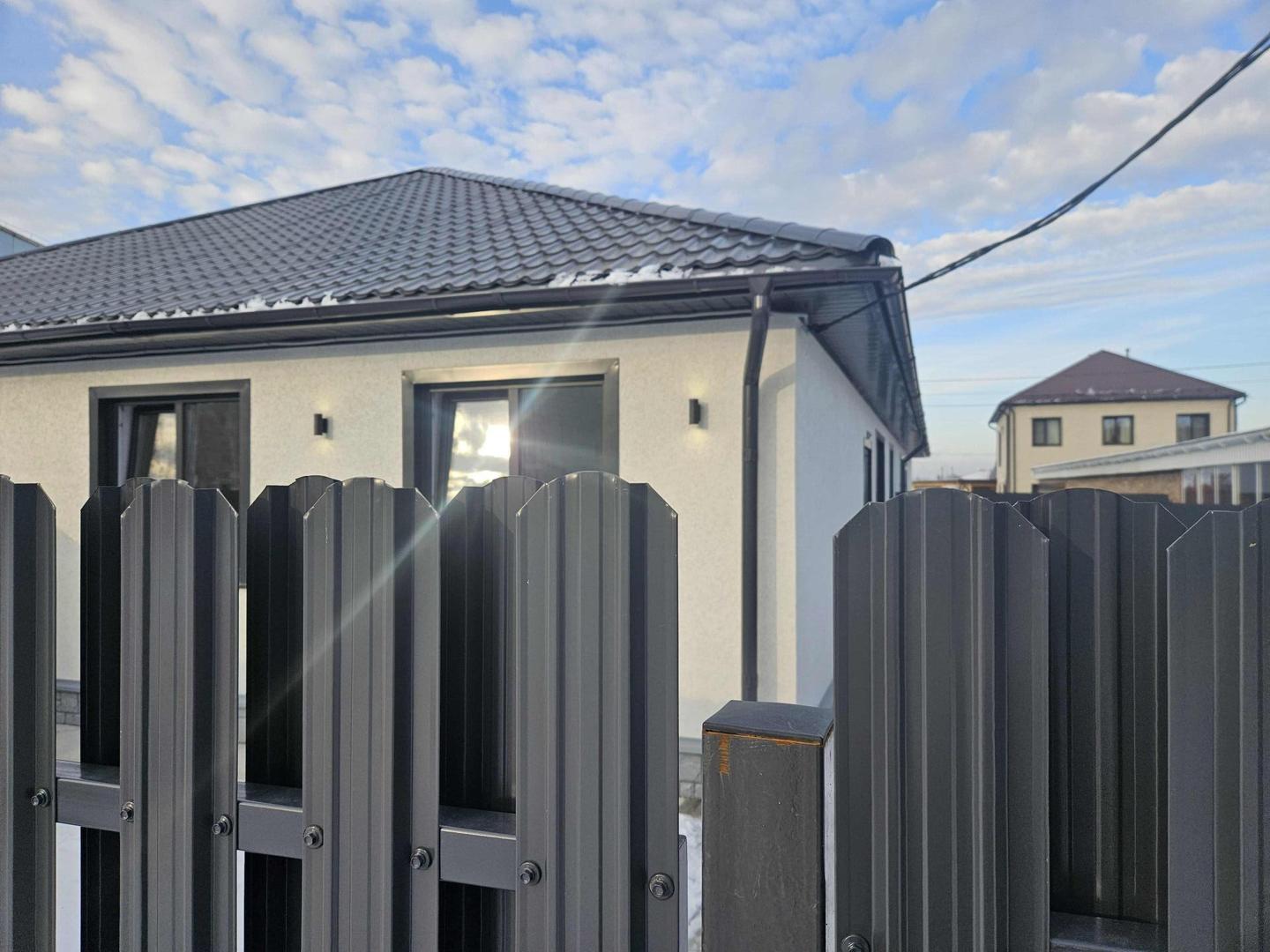 - Забор металочерепица, дом огорожен полностью.