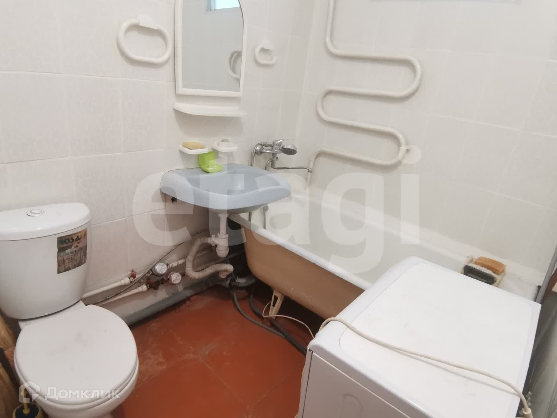 Просторный санузел в светлом кафеле. Установлены счетчики.