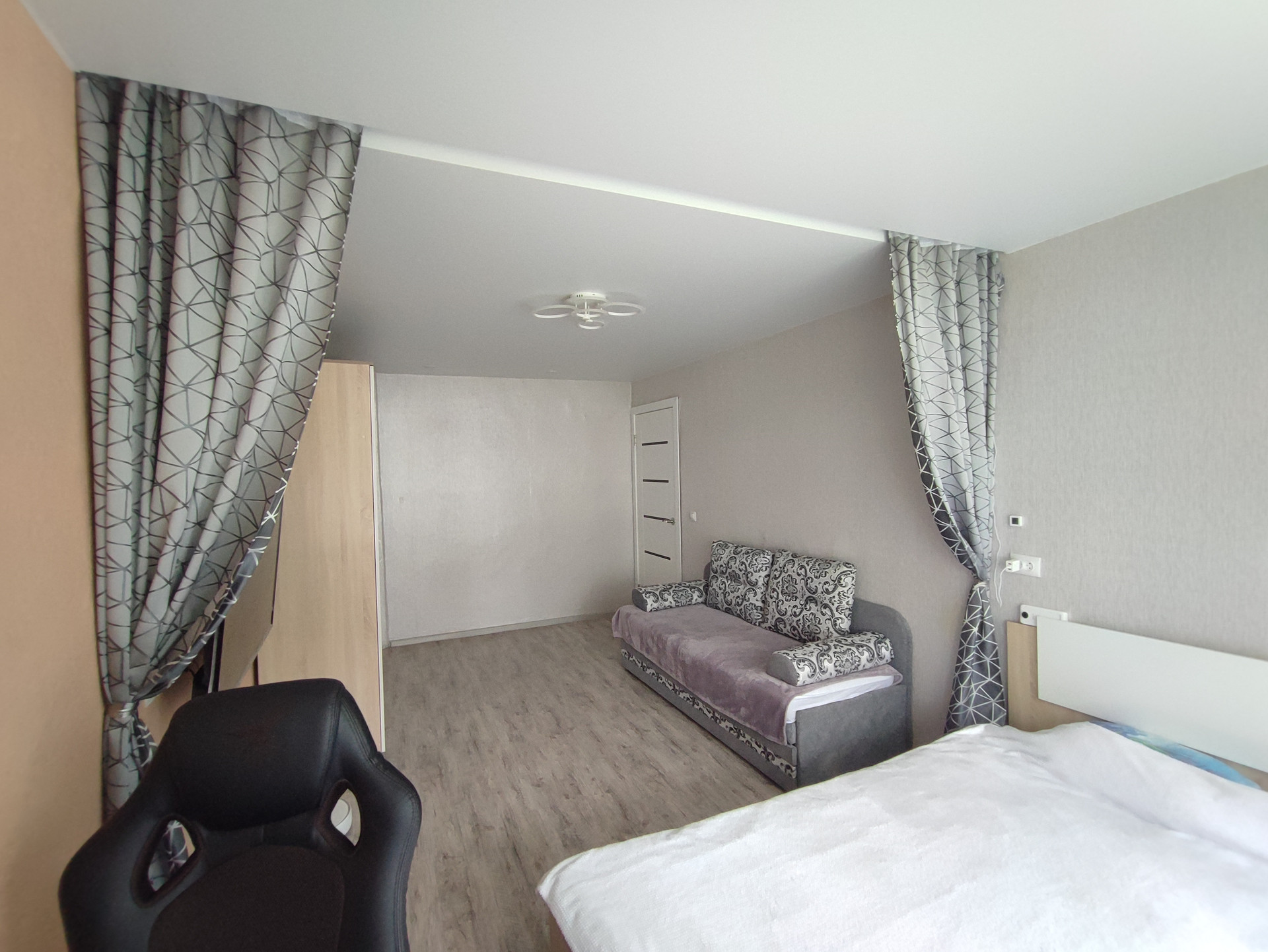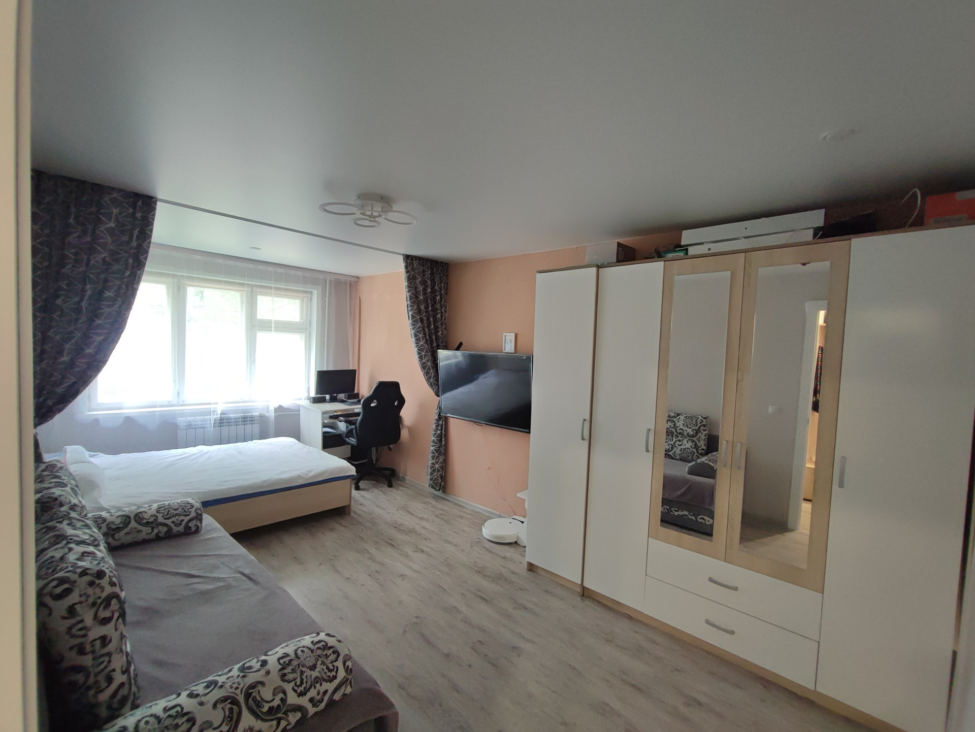 В квартире полностью заменена проводка, натяжные потолки, на полу линолеум, сан.узел раздельный и весь в кафеле, на кухне под раковиной установлен бойлер на 15л, в том году заменено отопление, зимой в квартире жарко, в комнатах установлены межкомнатные двери. Также в квартире имеется кладовка. Окна выходят на аллею.  В квартире остается: