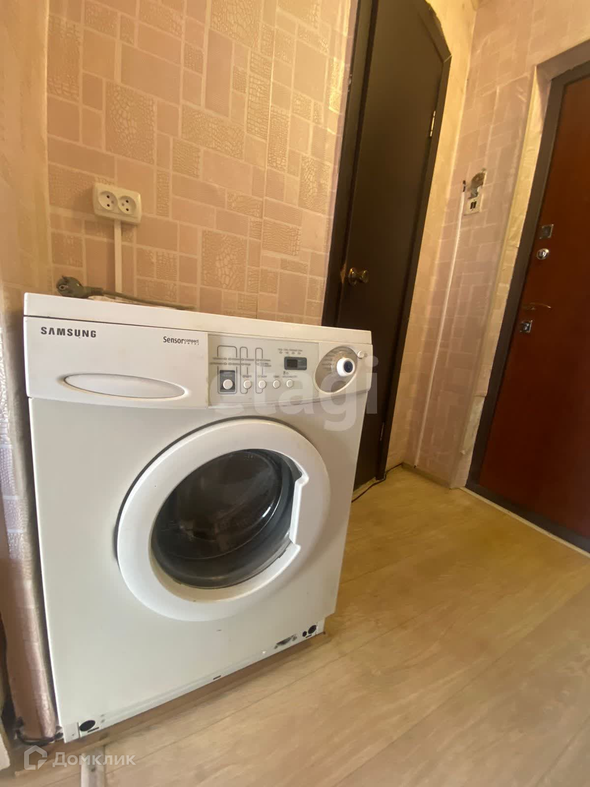 В квартире есть кухонный гарнитур, стиральная машина, кровать, мебель для хранения вещей.
