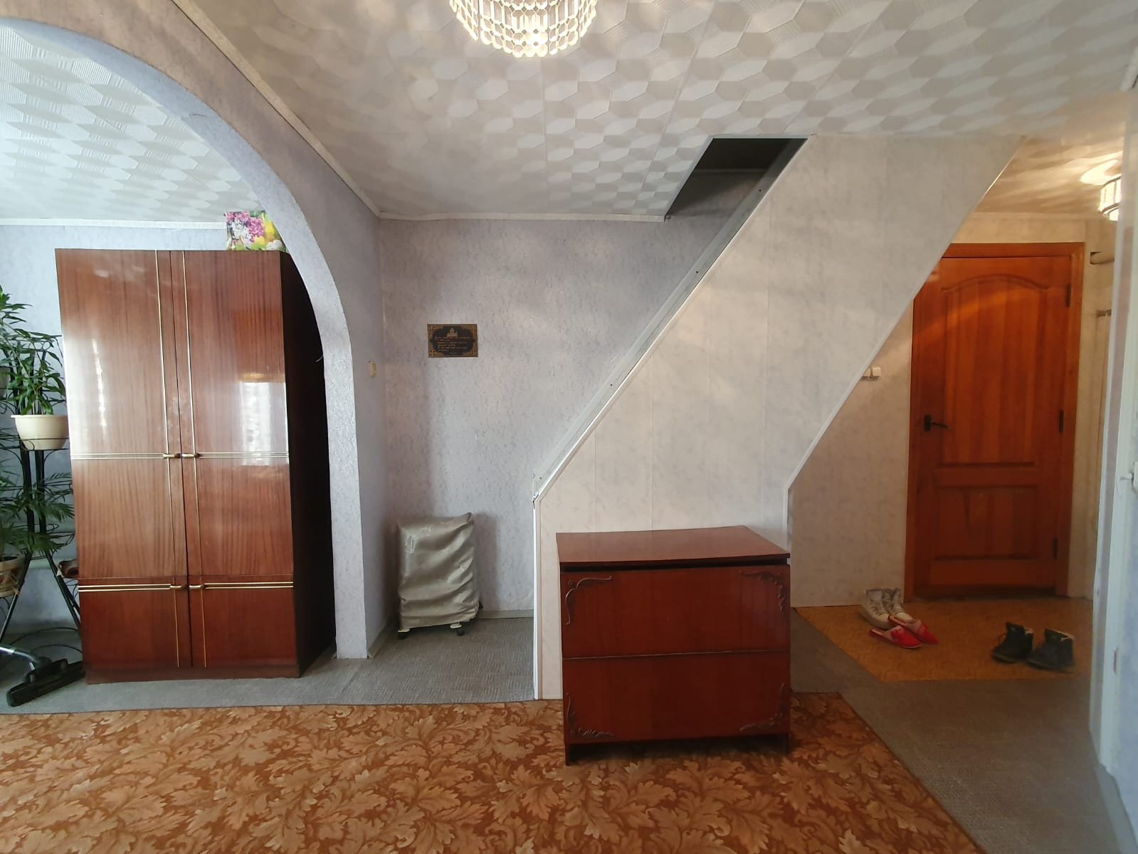 Под лестницей вход/выход в подпол кратный по площади границам дома. Капитальный гараж в конструкции дома со сквозным входом/выходом.
