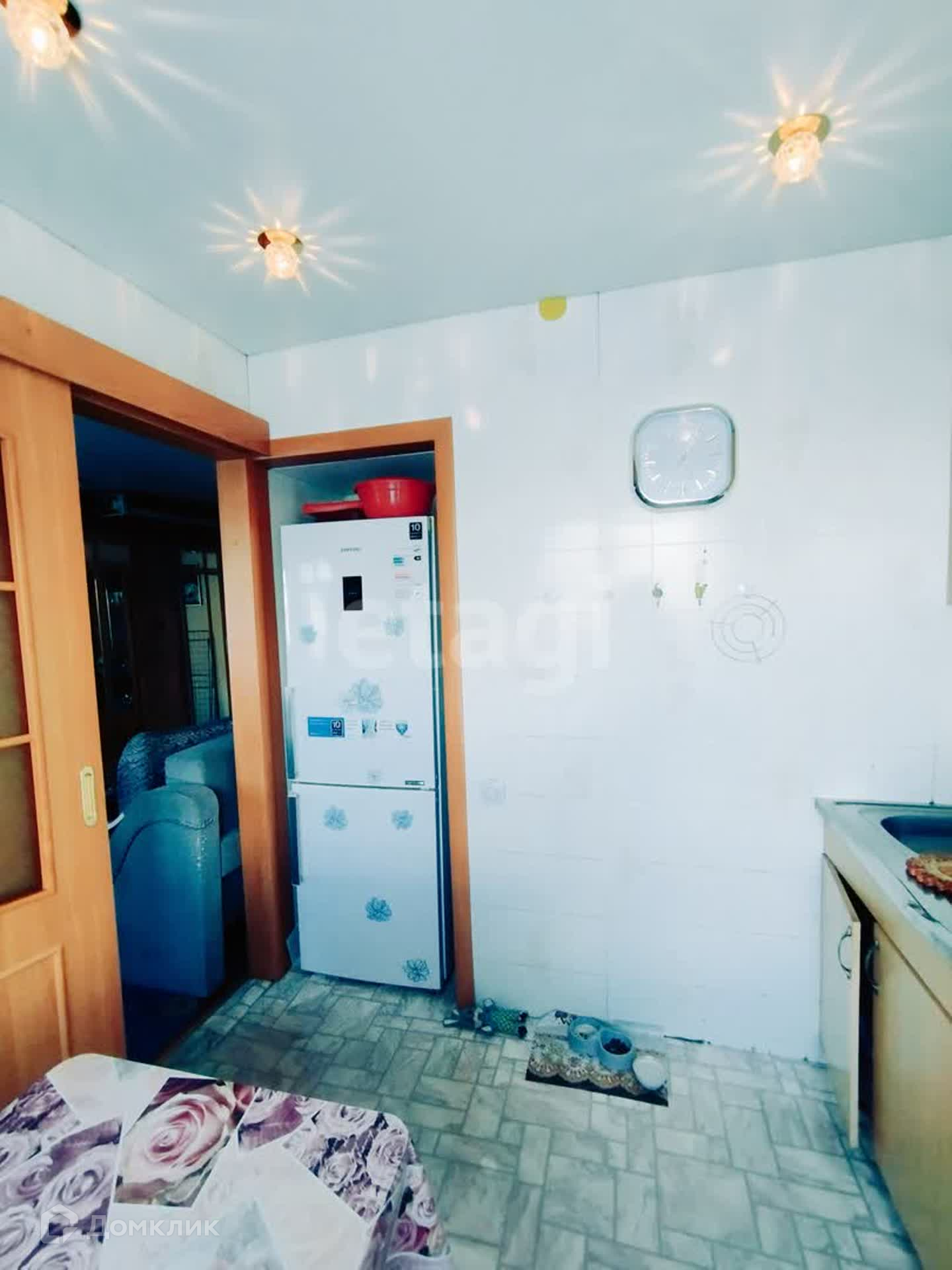 На кухне установлена дверь купе, имеется ниша под холодильник, остается кухонный гарнитур, стол, табуреты.