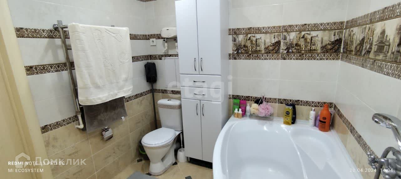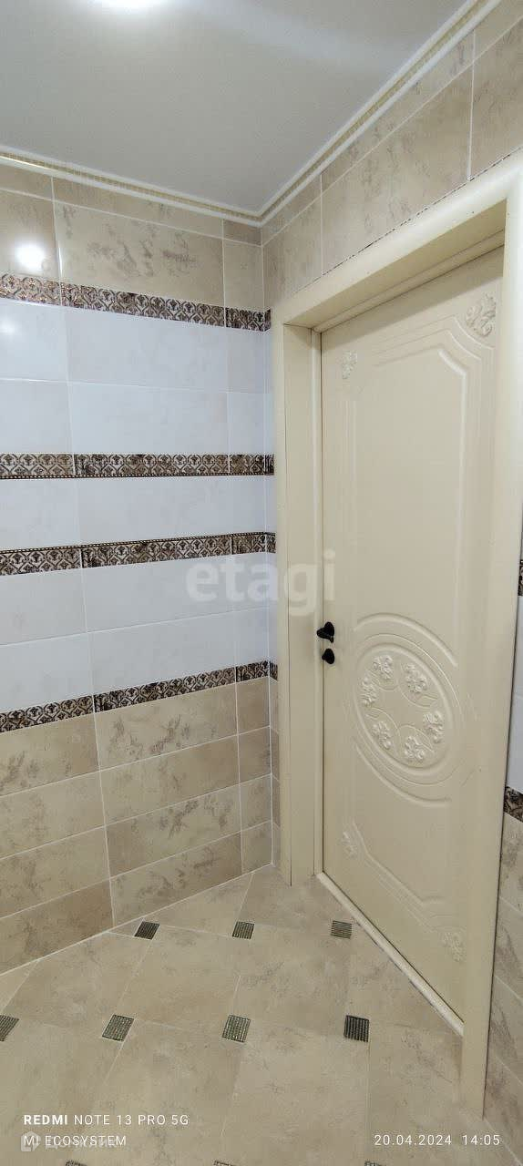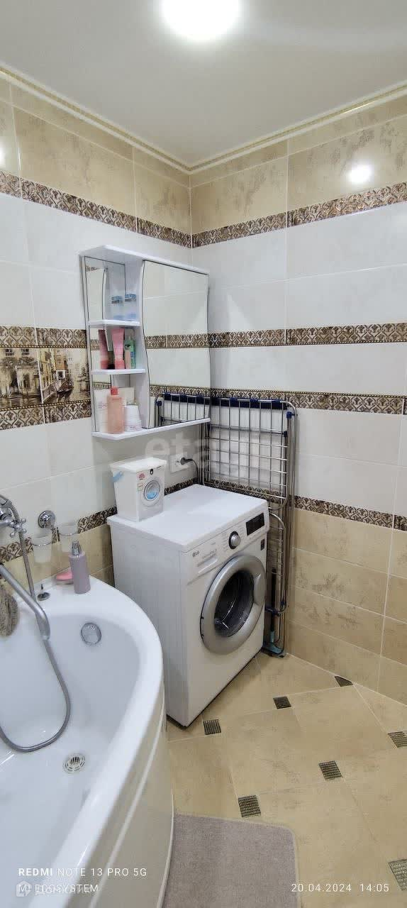 Санузел просторный, совмещенный, в кафеле. При продаже остается кухонный гарнитур, встроенный шкаф-купе, в ванной шкафы.