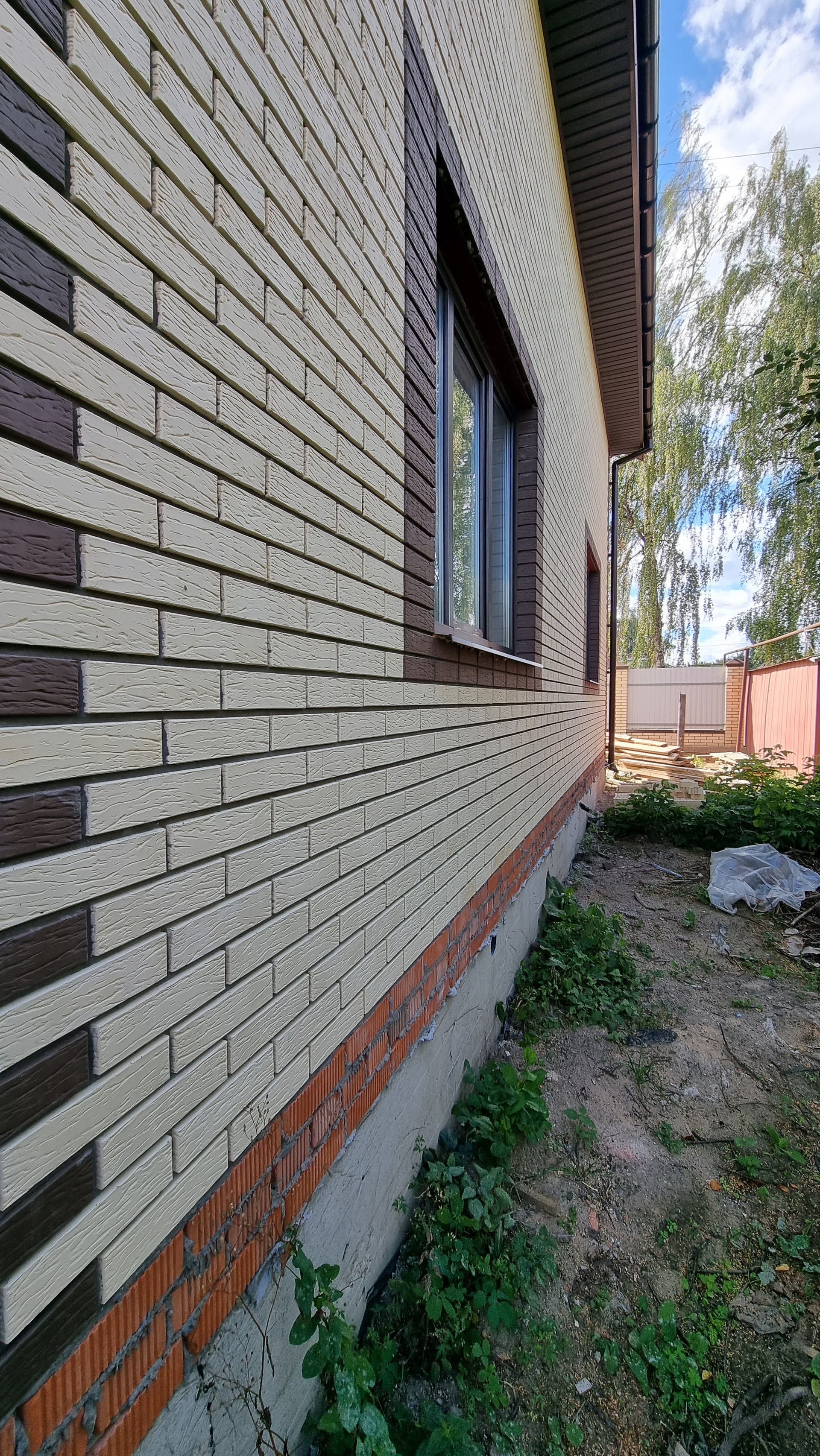 выровненный, правильной формы, по фасаду кирпичный забор.