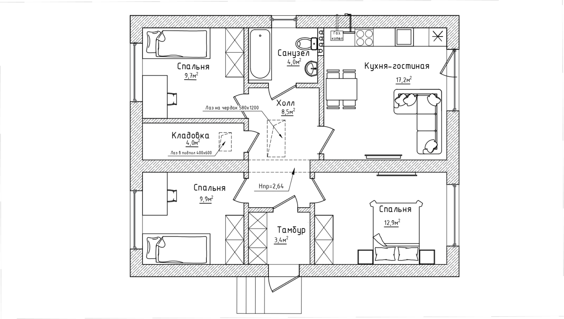 Готовый одноэтажный дом площадью  76 кв.м. из газобетона продаётся в поселке нового поколения - Городской. Поселок располагается в 15 минутах езды от центра города (ТЦ Бисмарк) в черте города. Рядом с Беляницами.
