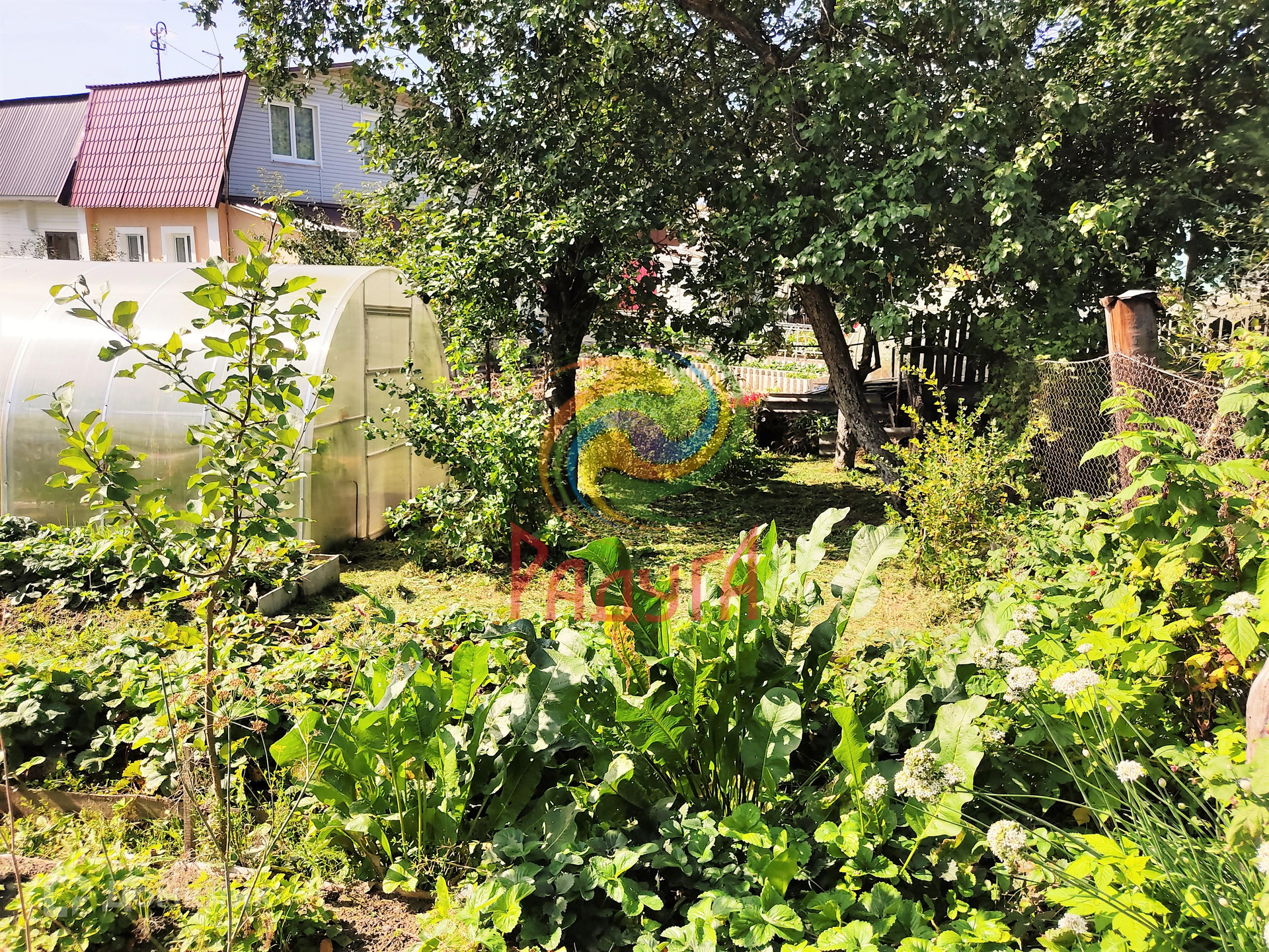 Земельный участок очень сухой, ухоженный, имеются 2 теплицы, клумбы для цветов, плодовые деревья и кусты. Свой виноградник, достаточно места для овощей.