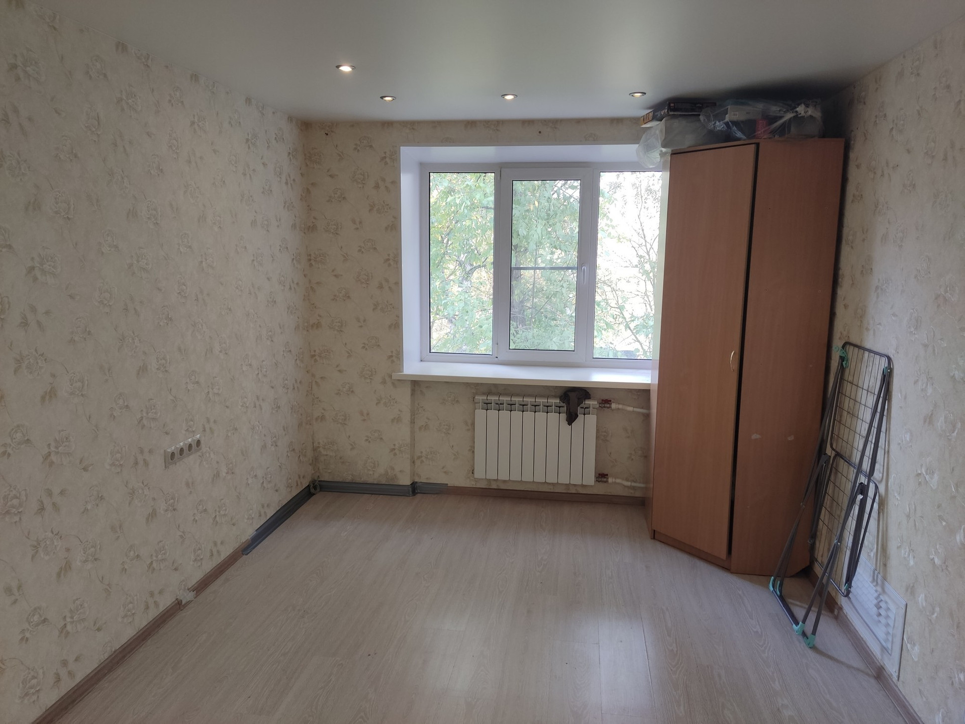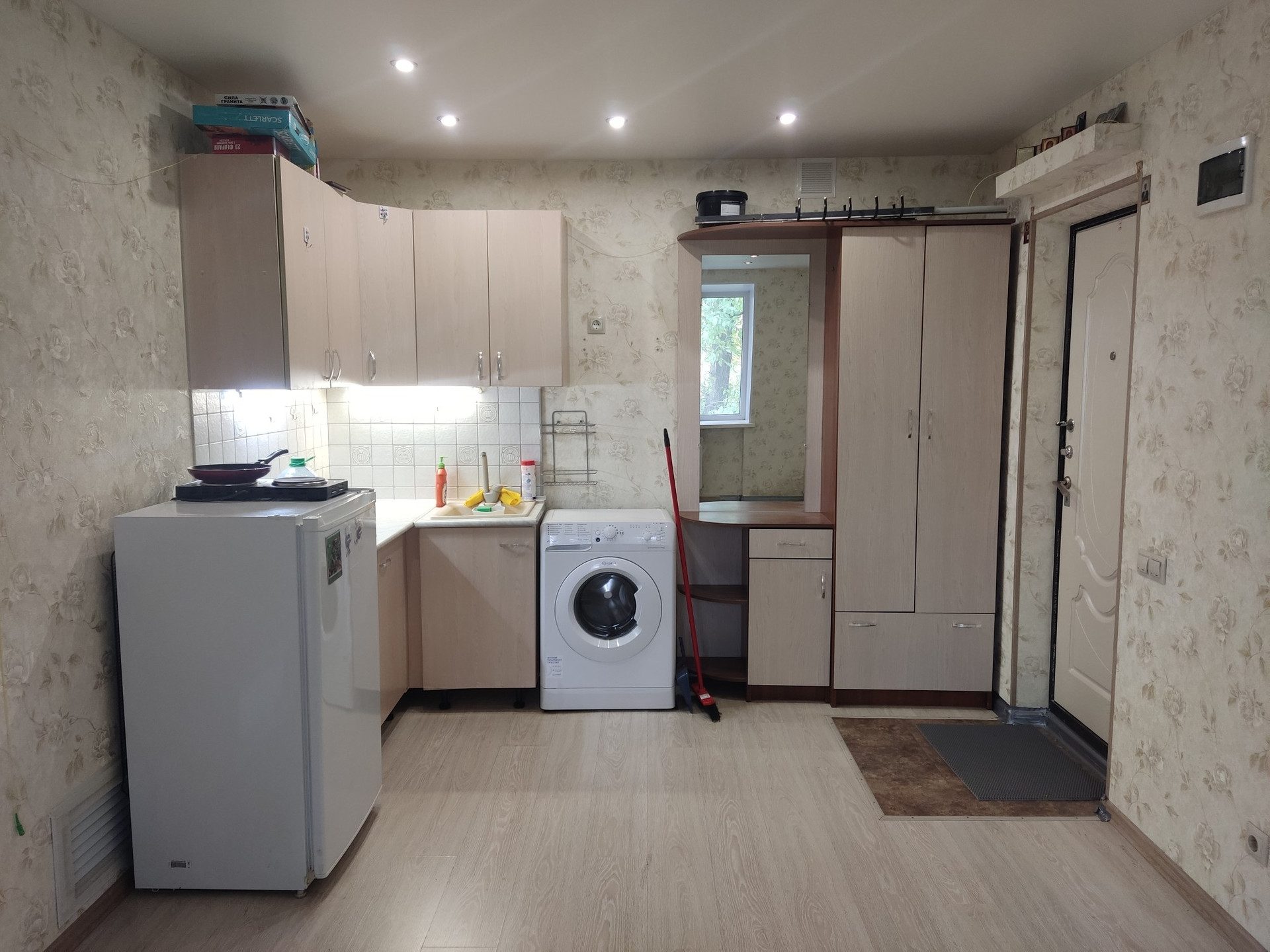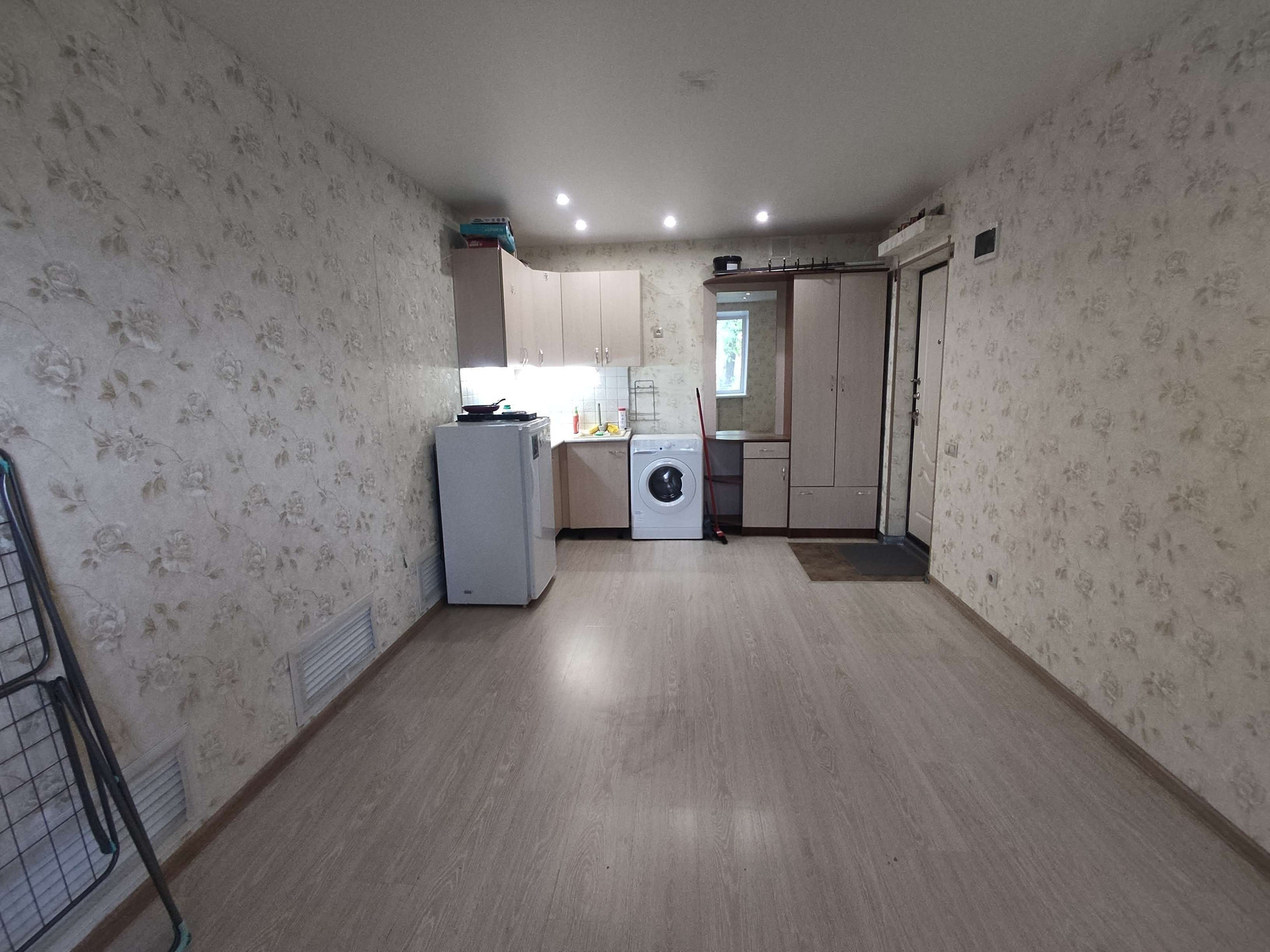 Уютная, очень тёплая комната. Присутствует раковина с горячей-холодной водой, также есть слив под стиральную машину. Окно пластиковое. В стене оборудованно отопление, особенно зимой очень тепло.