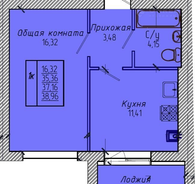 Общая площадь 39 м2