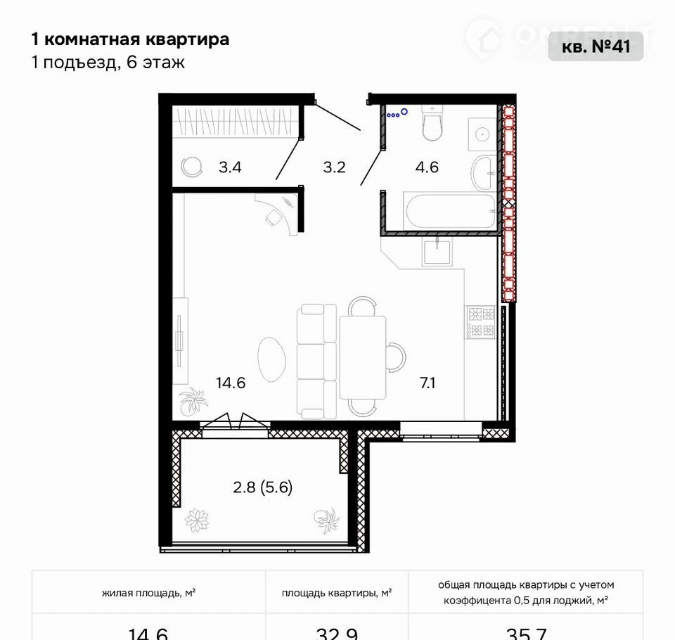 Общая площадь 38.5 м2