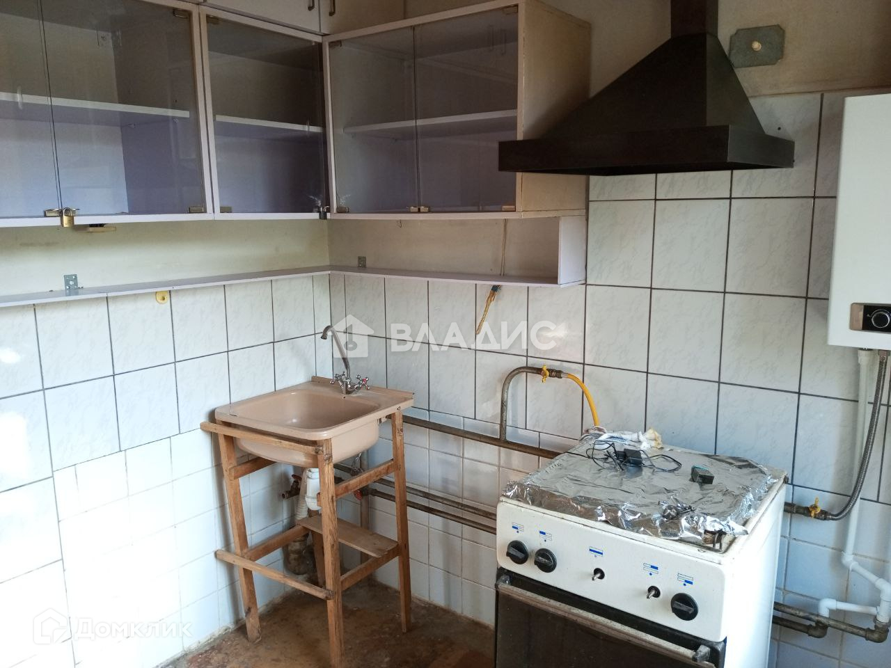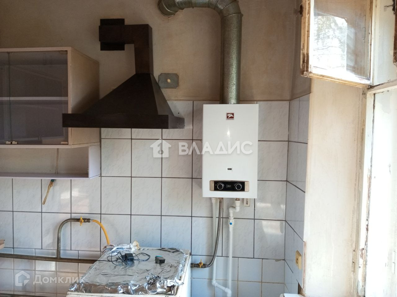 Кухня правильной квадратной формы, установлена новая газовая колонка, вытяжка.