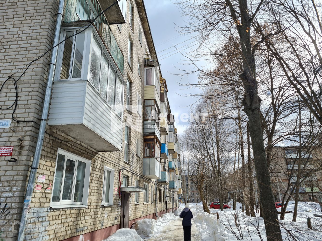 Балкон выходит во двор, перед домом растут деревья.