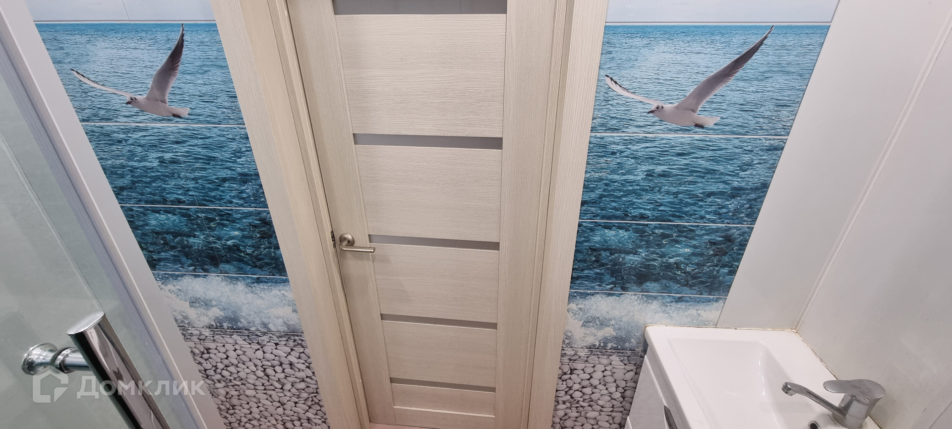 Санузел совмещённый отделан плиткой в морском стиле.