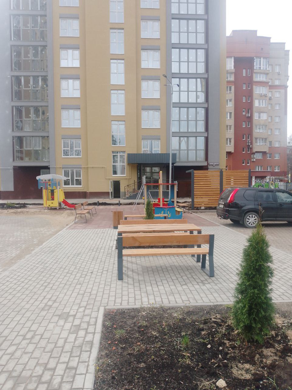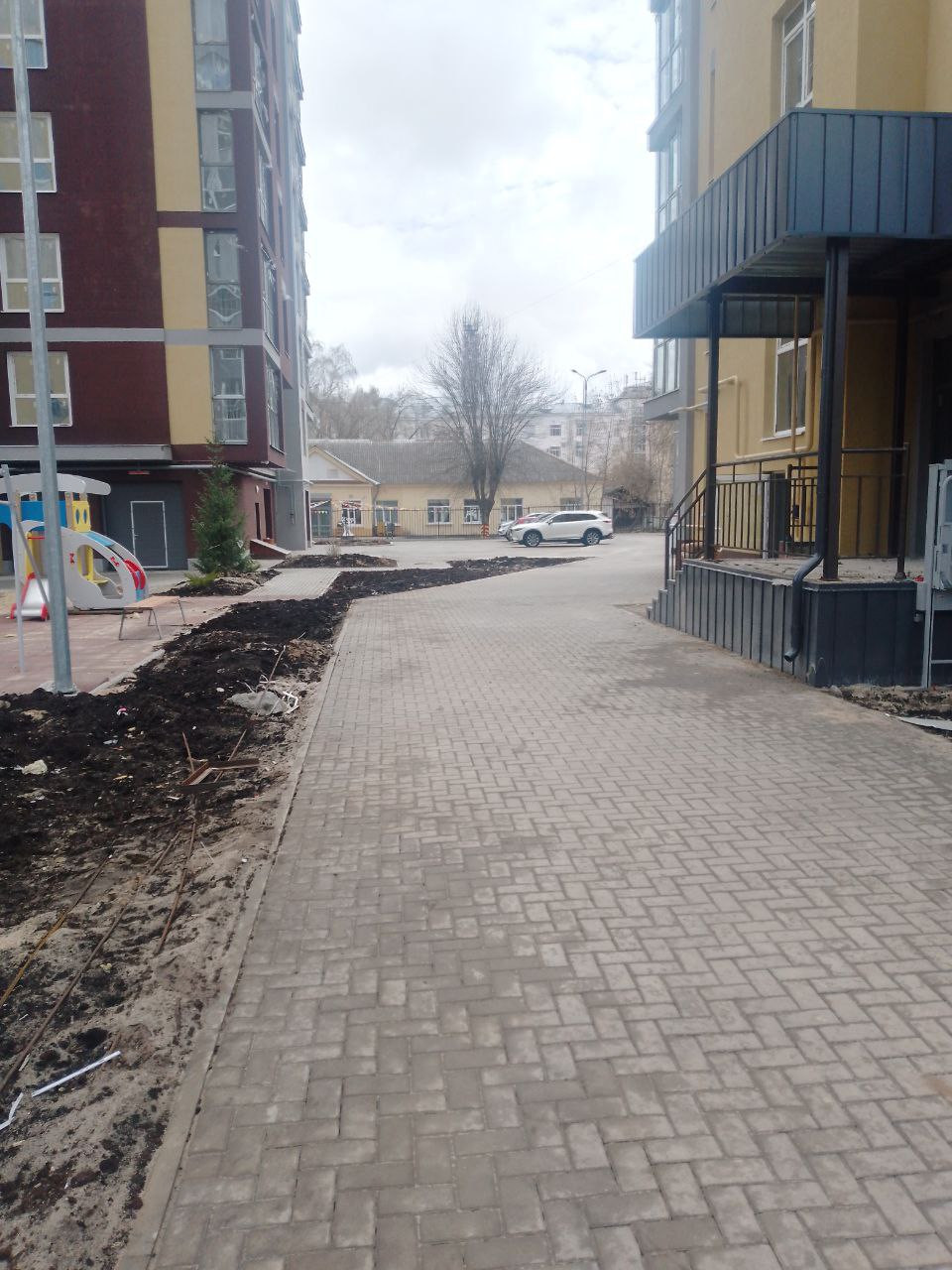 Закрытая просторная территория на 3 дома, уже благоустроена, есть детские площадки, через дорогу детский парк