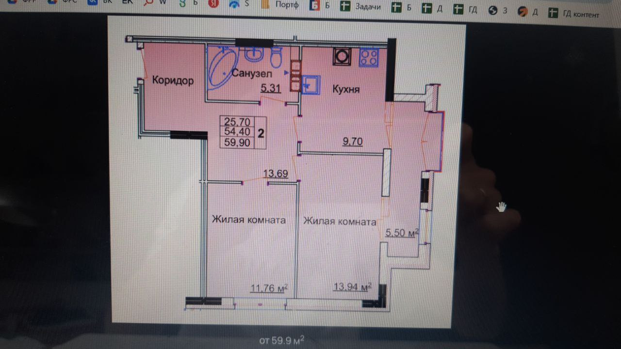 На данный момент планировка в квартире такая, как на фото 2 (розовая схема), но по документам она переделана как на фото 3 (белая схема), можете оставить какую хотите, хоть однокомнатную. Межкомнатных перегородок в квартире нет. Дом монолитный, очень мало несущих стен и перегородок.
