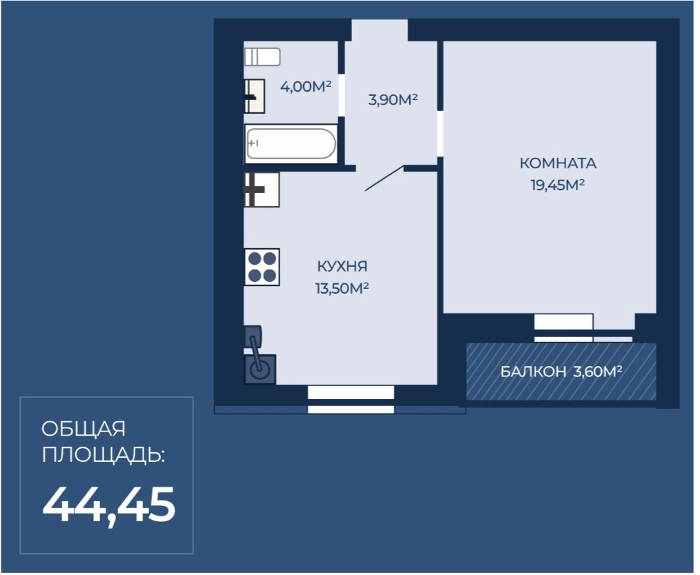 Общая площадь 44.5 м2