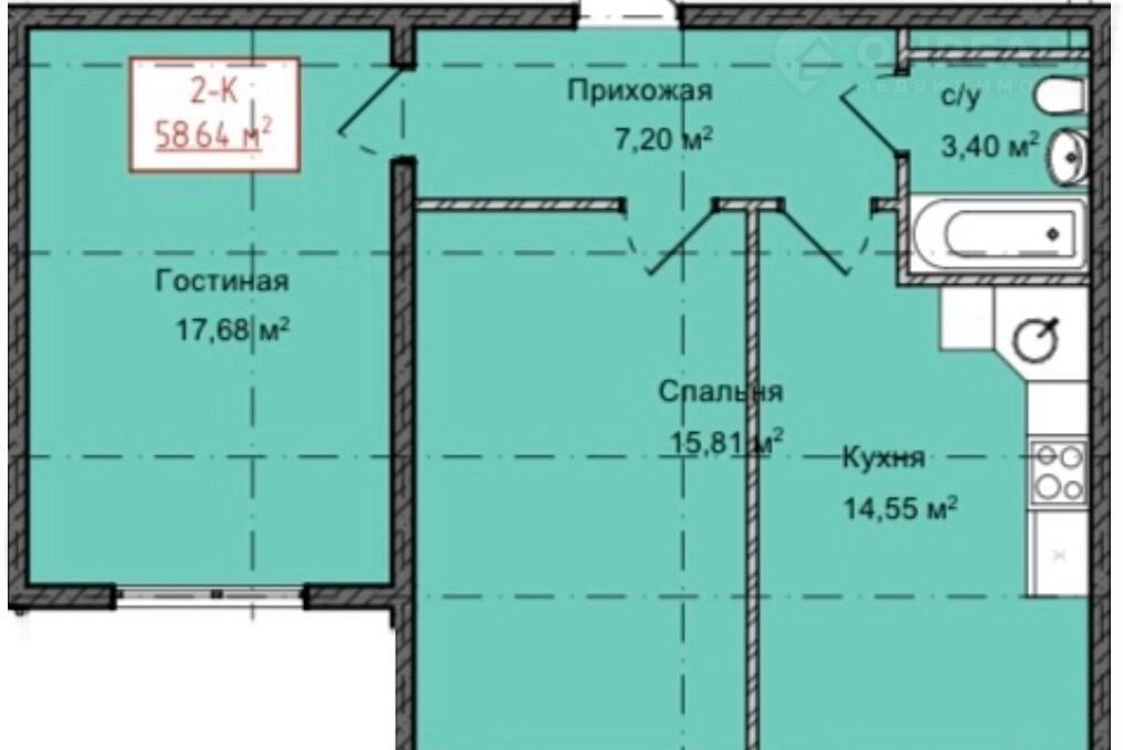 Общая площадь 58.6 м2