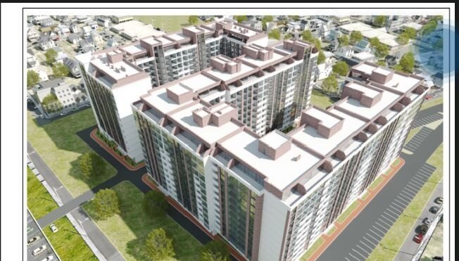 Новое здание высотой 13 этажей, построенное по технологии монолитно-кирпичного строительства – прочность и долговечность.