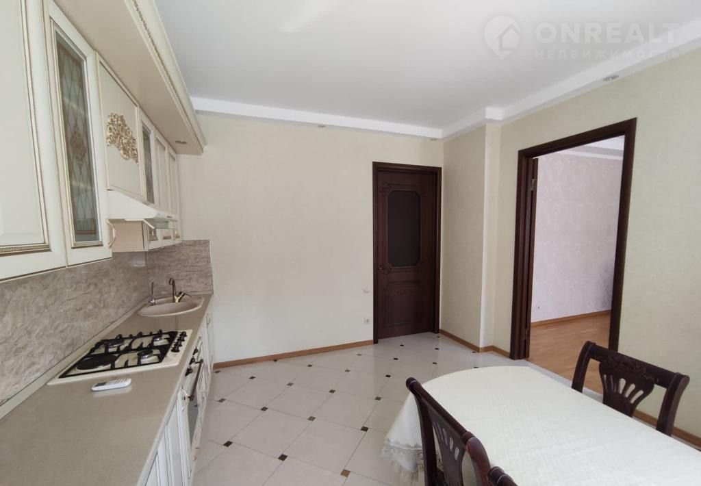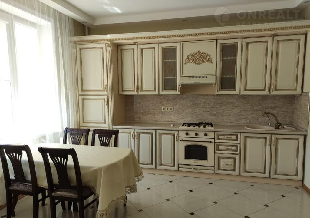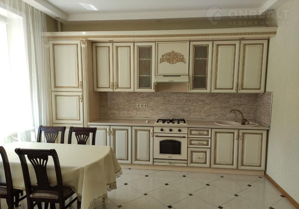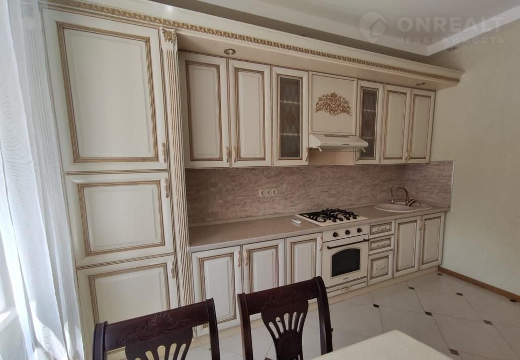 Хозяек порадует большая кухня со множеством навесных и напольных шкафов.